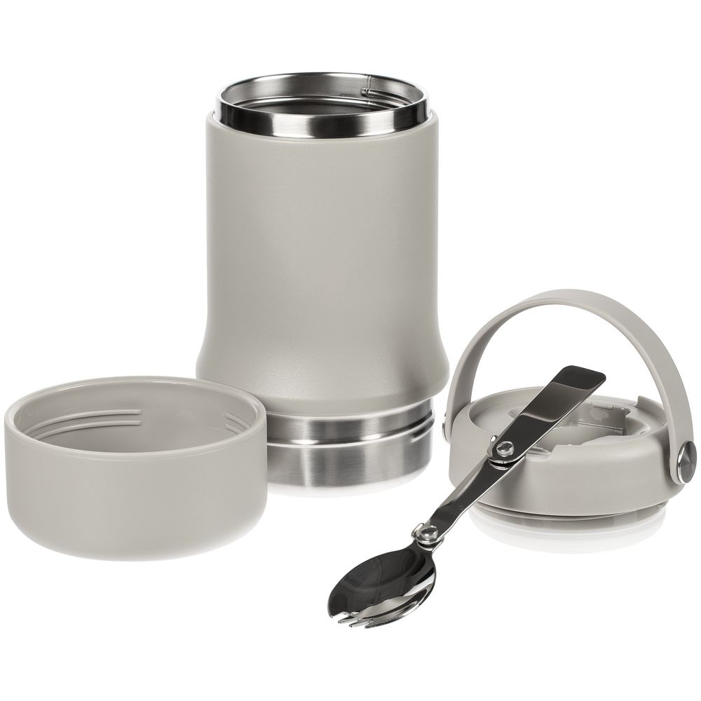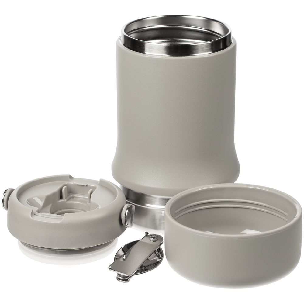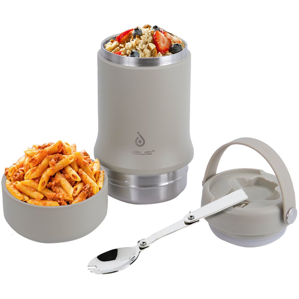 Tabenodo — универсальный многофункциональный термос для работы, школы, похода и путешествия. В компактном корпусе разместились ложка, тарелка и емкость для любимого блюда. Матовая поверхность приятна на ощупь, а силиконовая ручка удобна для переноски.