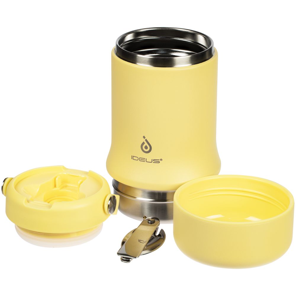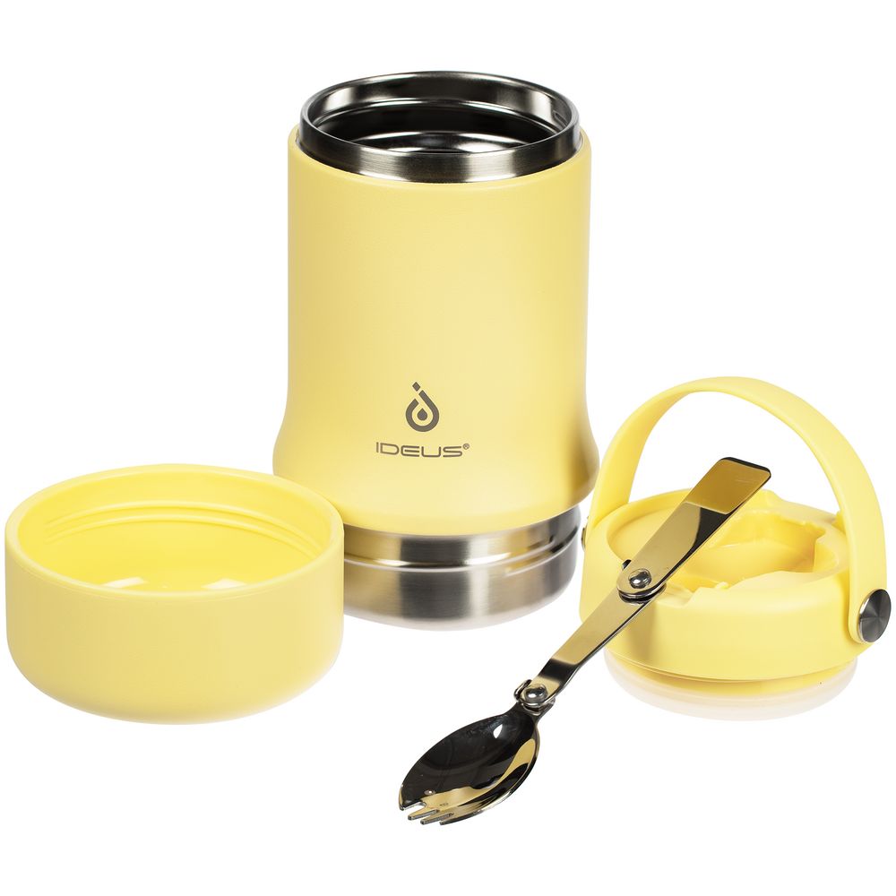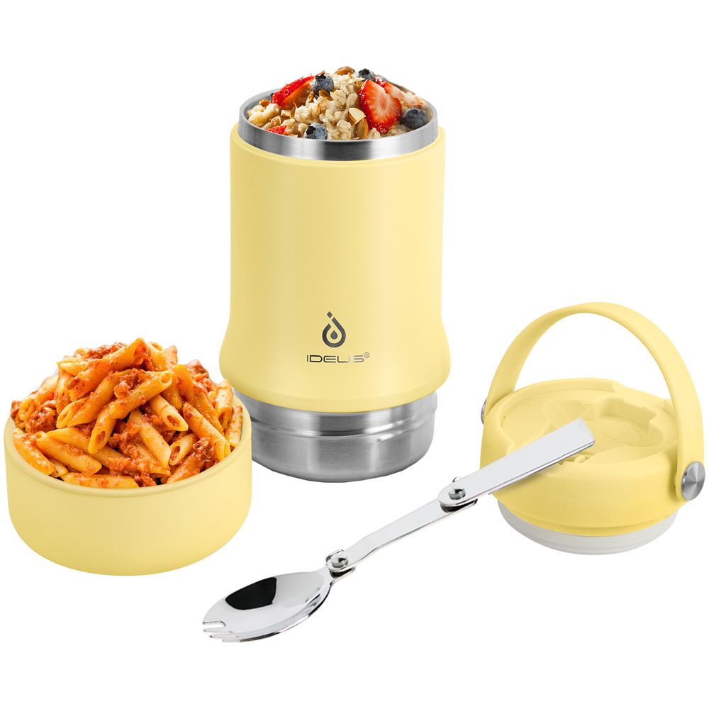 Tabenodo — универсальный многофункциональный термос для работы, школы, похода и путешествия. В компактном корпусе разместились ложка, тарелка и емкость для любимого блюда. Матовая поверхность приятна на ощупь, а силиконовая ручка удобна для переноски.