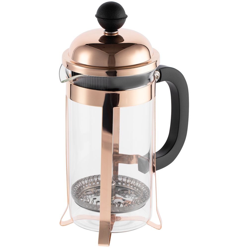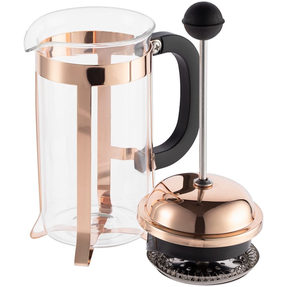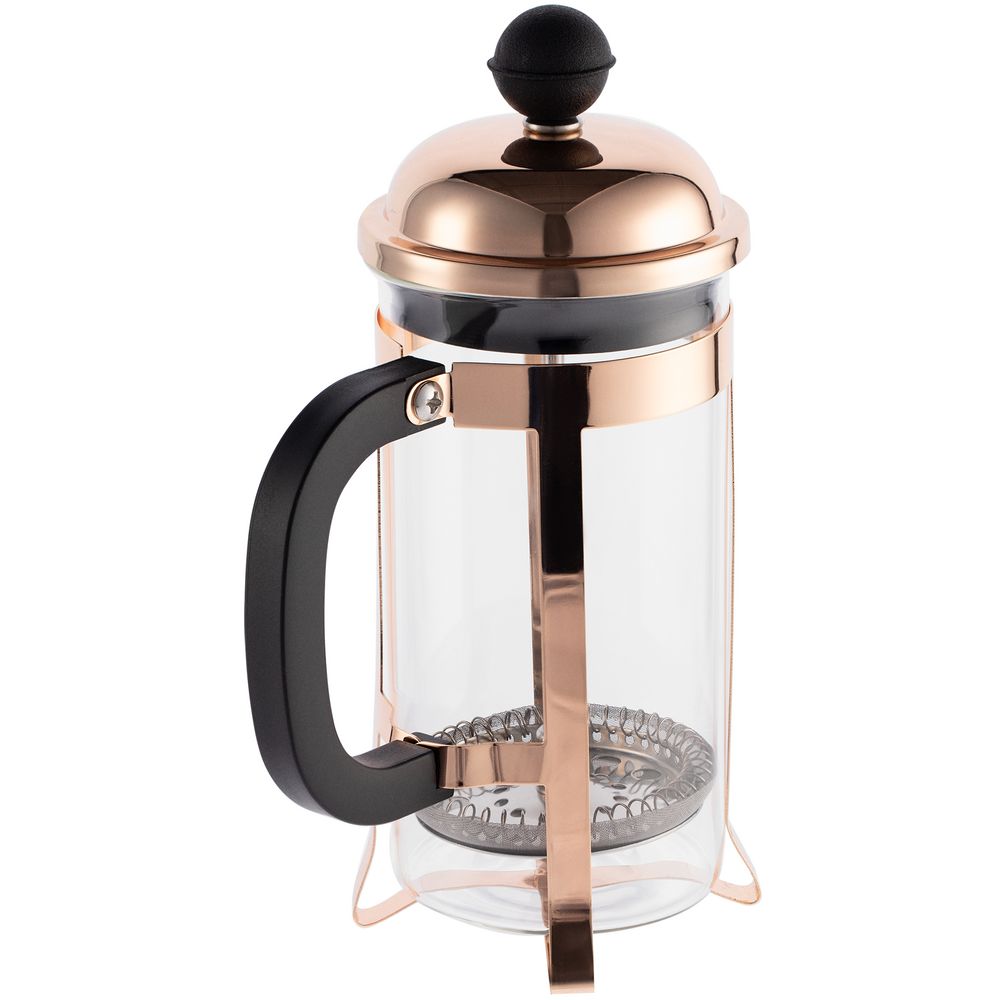 Элегантная оправа цвета розового золота защитит колбу от повреждений, а пластиковая ручка не даст обжечься о горячую поверхность.