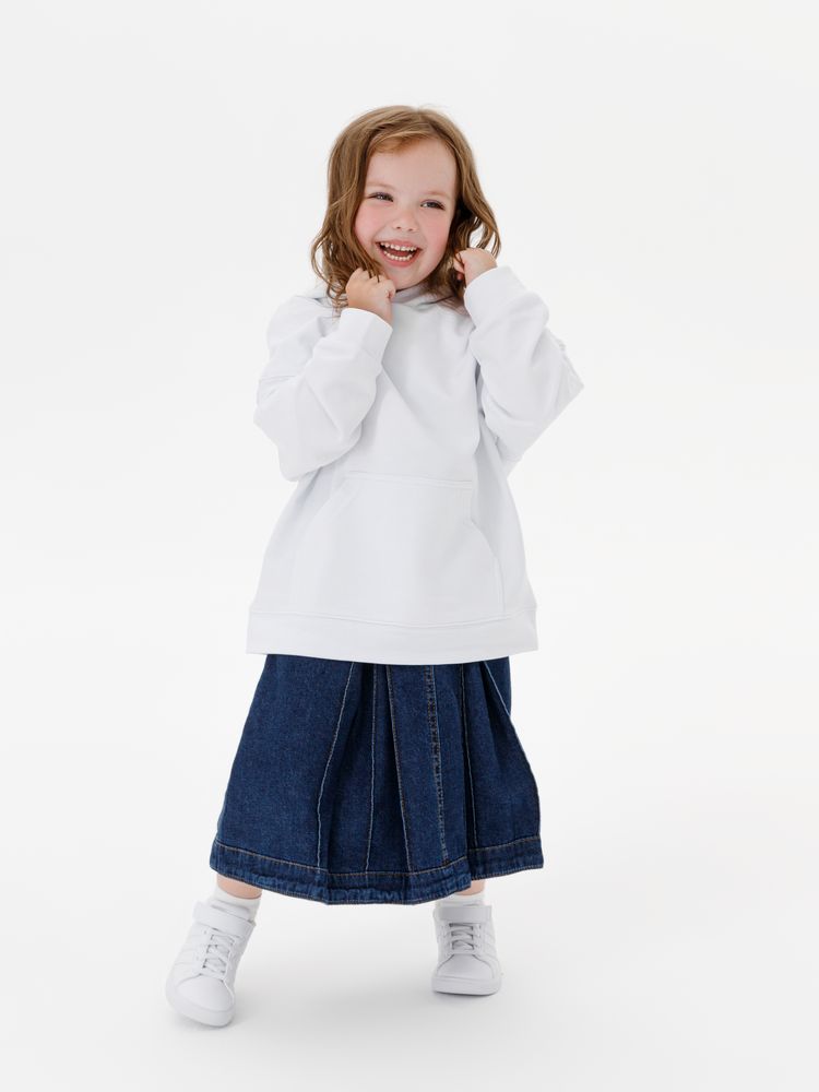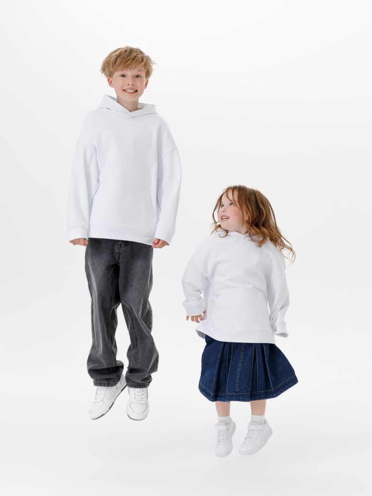 Детское худи оверсайз со спущенным плечом и карманом-кенгуру.