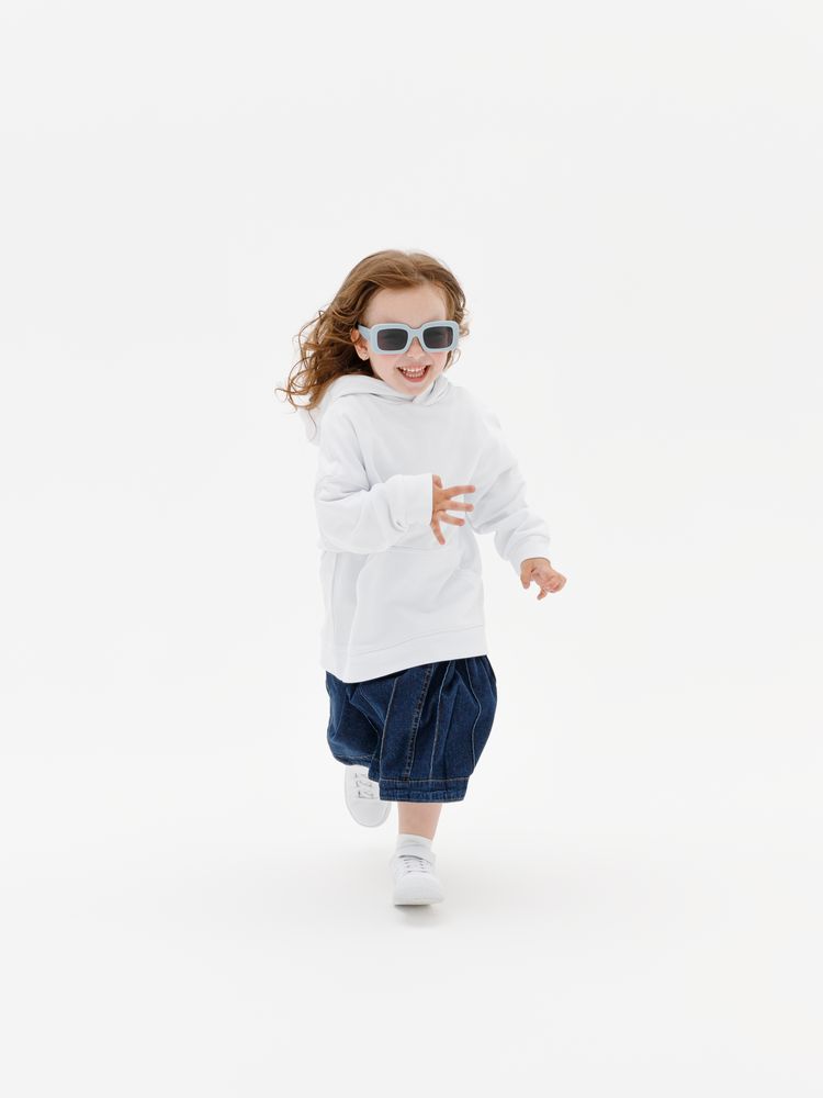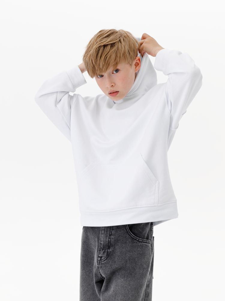 Детское худи оверсайз со спущенным плечом и карманом-кенгуру.