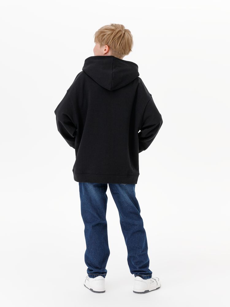 Детское худи оверсайз со спущенным плечом и карманом-кенгуру.