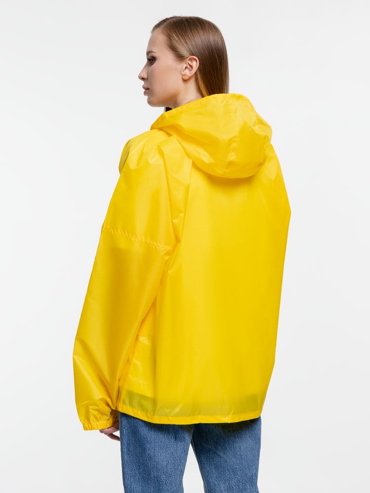 Укороченный дождевик свободного кроя из ткани таффета с влагозащитным покрытием. Складывается в мешочек — удобно брать с собой.