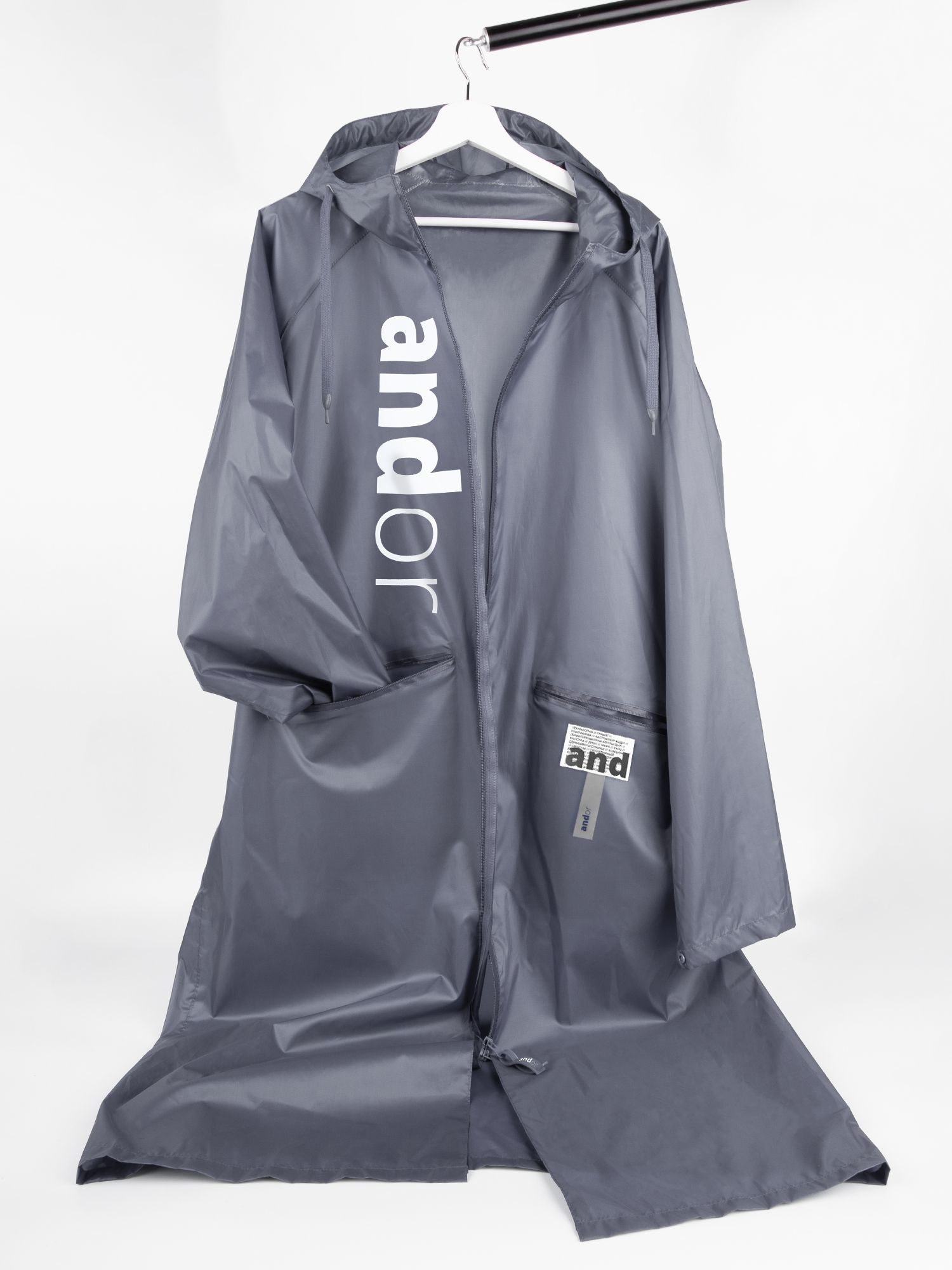 Плащ-дождевик на молнии с капюшоном из ткани таффета с полиуретановой пропиткой для защиты от сильного дождя.