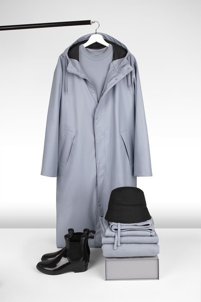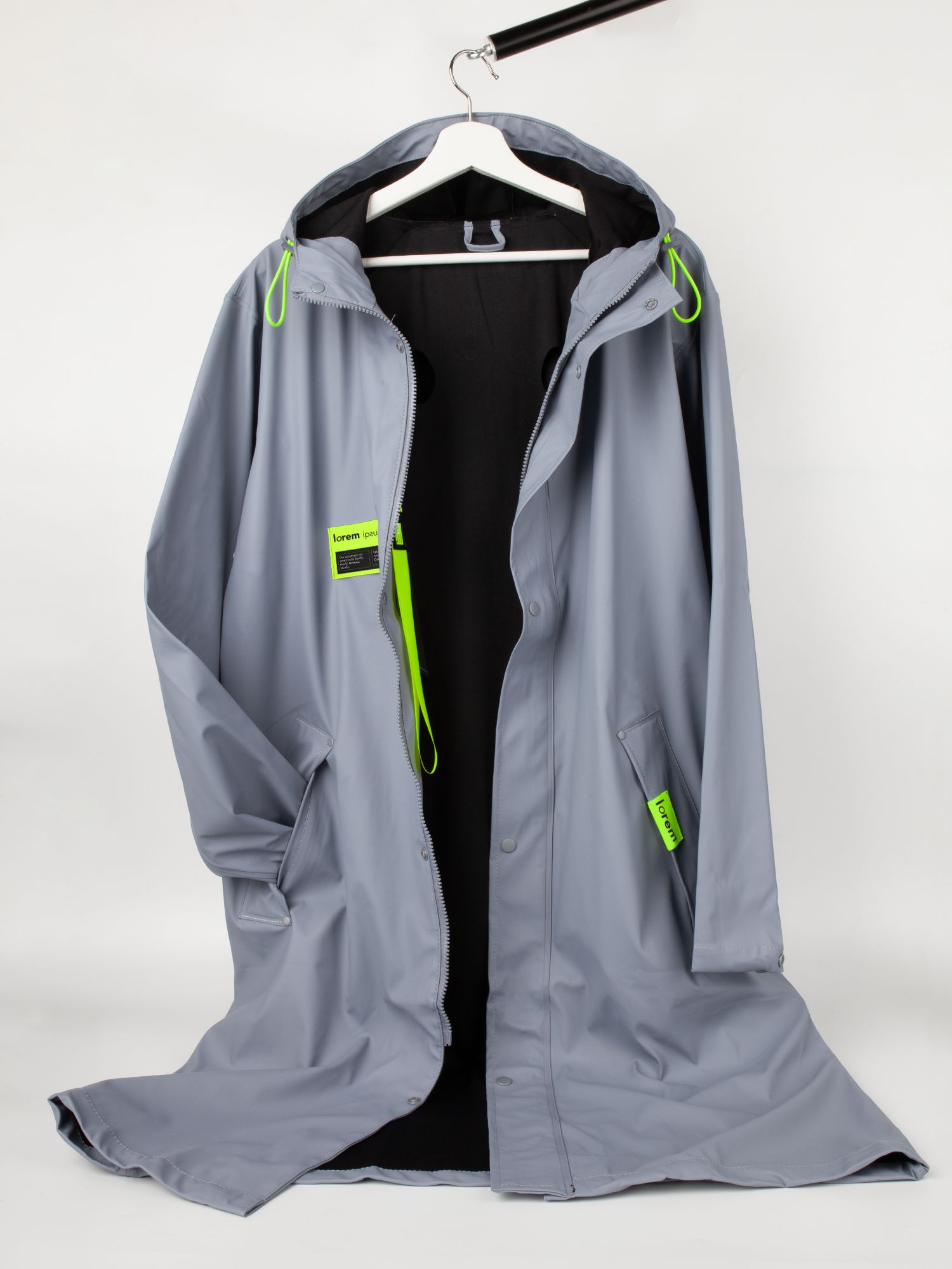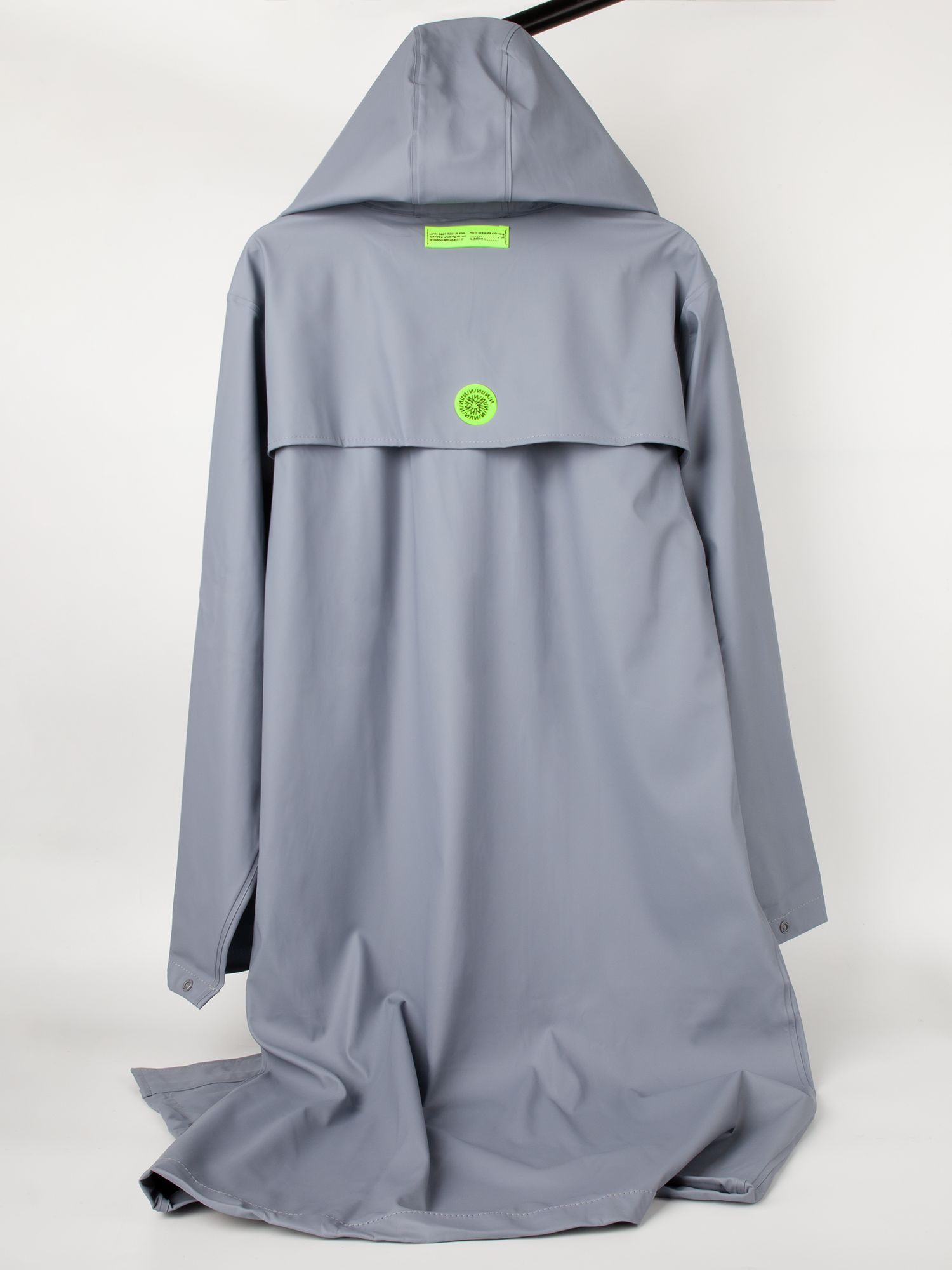 Плащ-дождевик с капюшоном из полиэстера с полиуретановым непромокаемым покрытием.