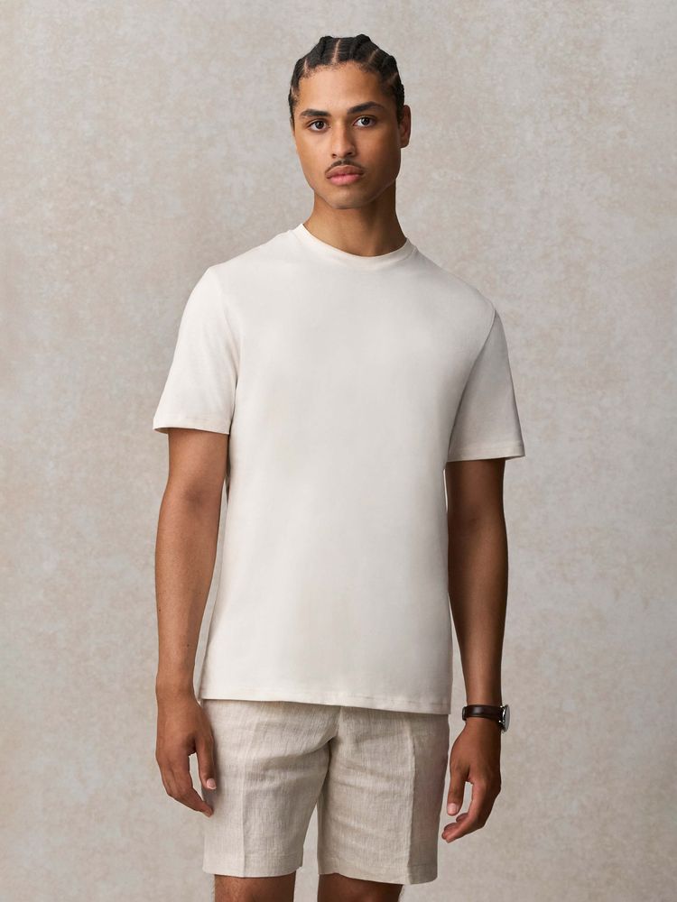 Благодаря идеальным пропорциям гребенного хлопка и переработанного полиэстера в составе, а также дополнительным обработкам ее полотно обладает повышенной мягкостью, шелковистостью и очень приятно на ощупь. Кроме того, футболка меньше мнется, не теряет форму после стирок и обладает высоким показателем Qmax — коэффициента мгновенной теплопроводности, который показывает, как быстро ткань забирает тепло от кожи. Именно он обеспечивает ощутимый эффект свежести и прохлады при первом прикосновении к ткани.