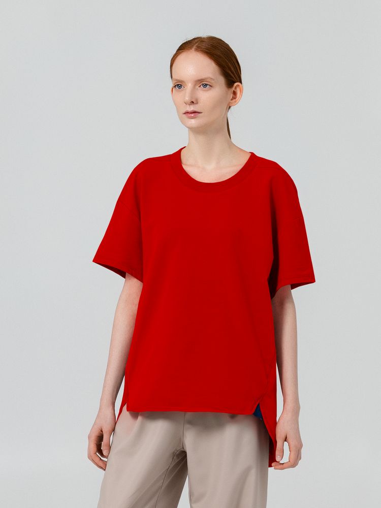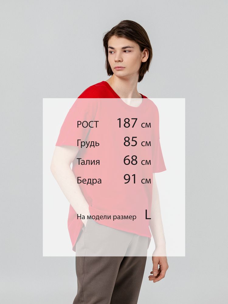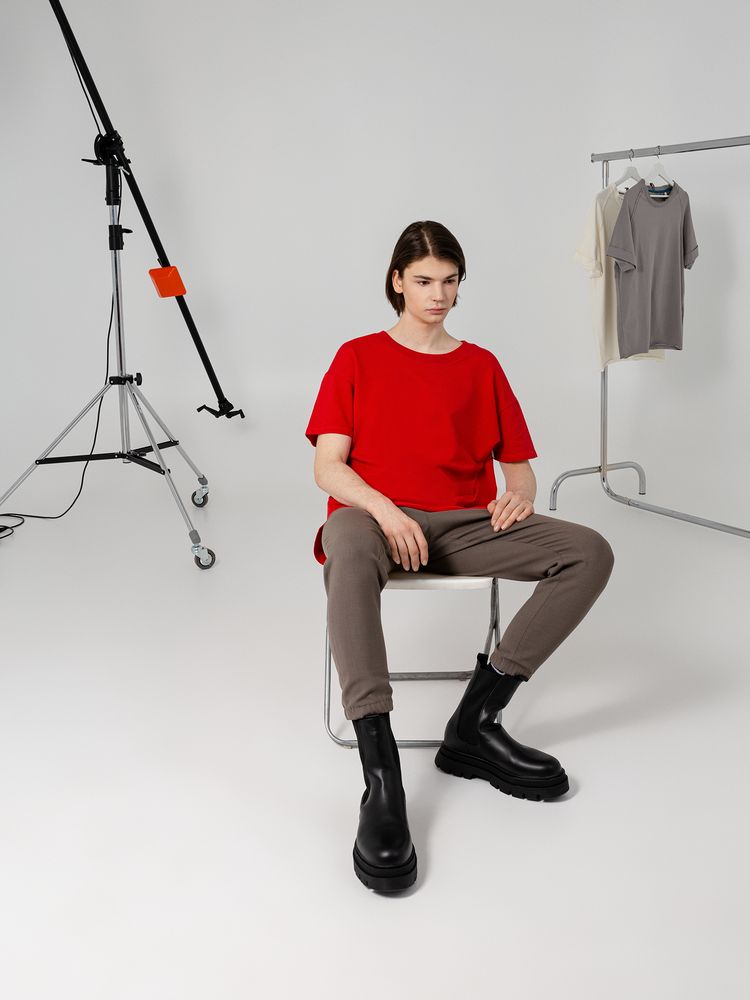 Футболка унисекс свободного кроя со спущенным плечом и смещенными плечевыми и боковыми швами.