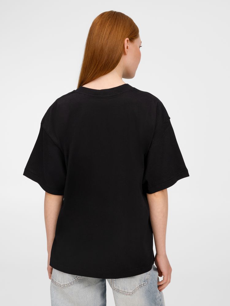 Футболка оверсайз унисекс с круглым вырезом и без боковых швов. Выполнена из смеси переработанного и обычного хлопка. Благодаря повышенной плотности отлично держит форму.