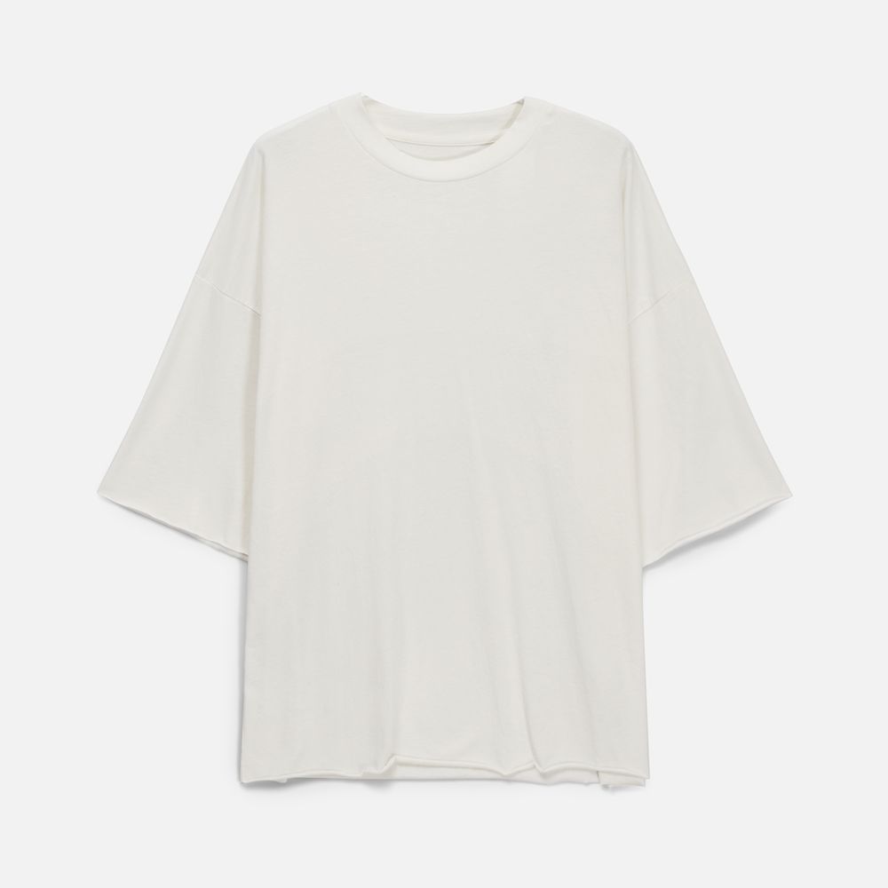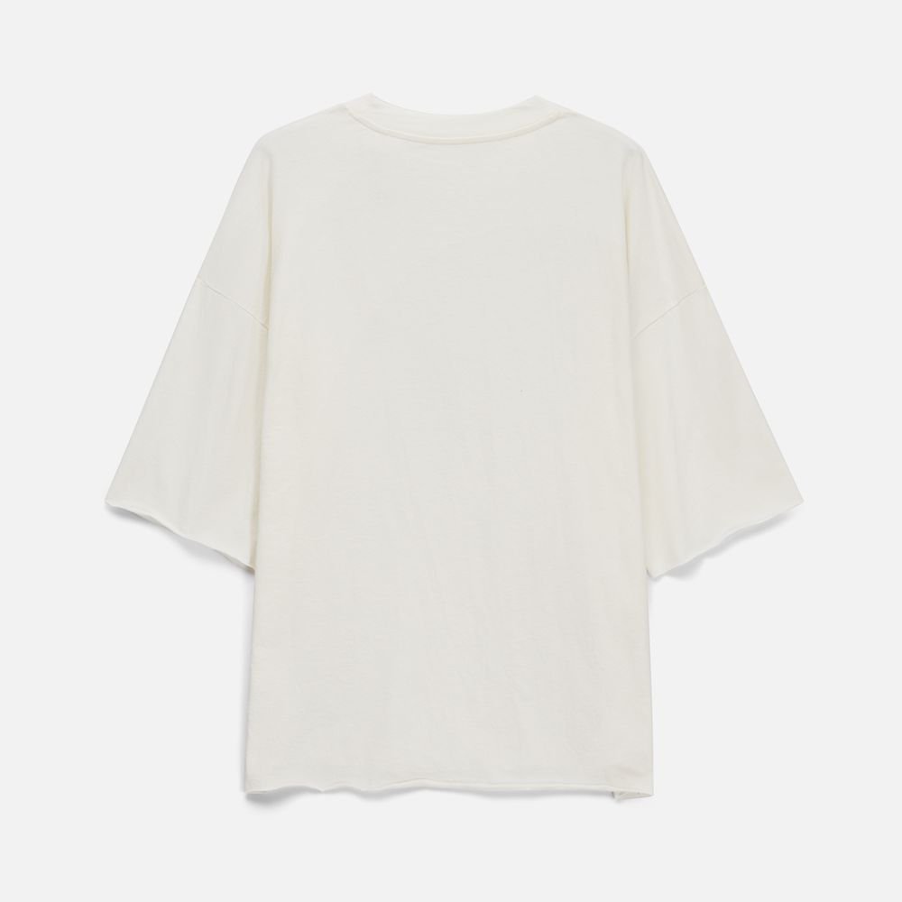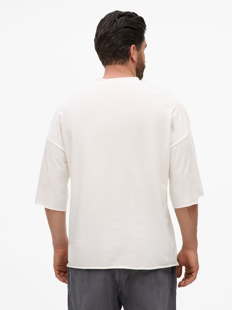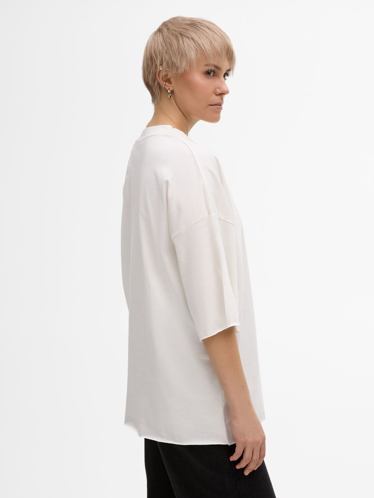 Футболка унисекс свободного кроя со спущенным плечом.