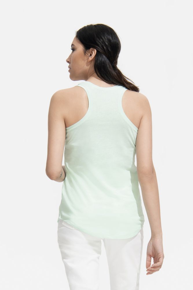 Женственная, приталенная и одновременно свободная модель. Закругленный низ изделия, глубокий вырез на спине («борцовская» спинка). Отделка выреза и пройм обтачкой из джерси. Тонкое джерси высшего качества, гребенной хлопок.