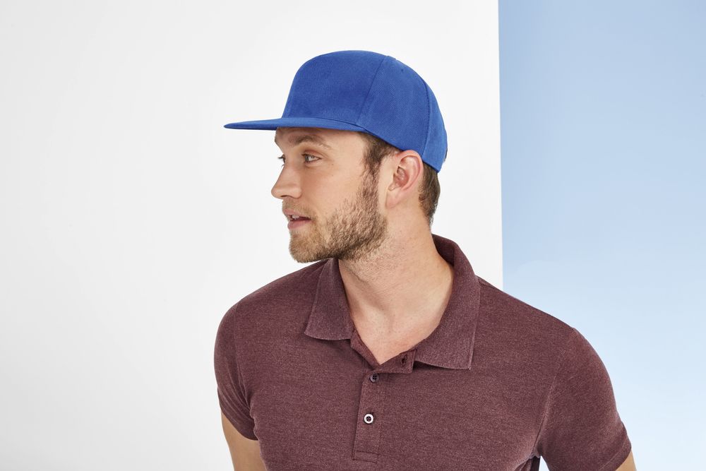 Однотонная бейсболка с 5 клиньями из материала, на ощупь напоминающего шерсть. Плоский козырек, 4 вышитых отверстия для вентиляции, регулируемая пластмассовая застежка сзади.