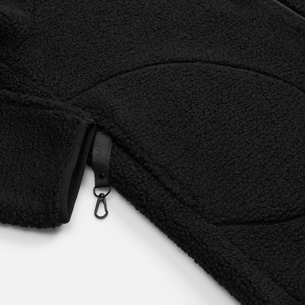 Куртка дополнена двумя боковыми карманами: в правом предусмотрен карабин для ключей или пропуска — практичная деталь для повседневной жизни. Молния с двойным бегунком позволяет регулировать посадку и добавляет функциональности.