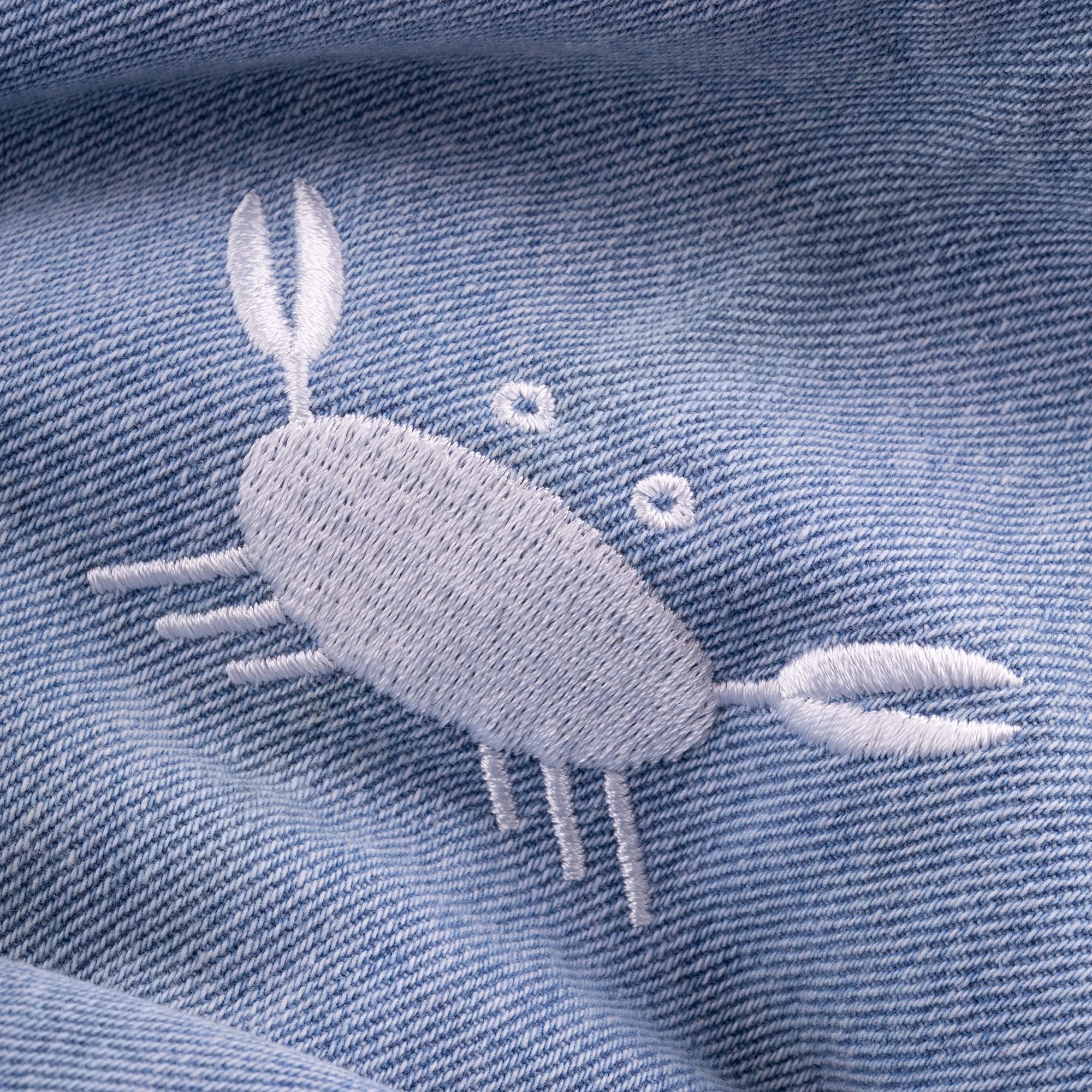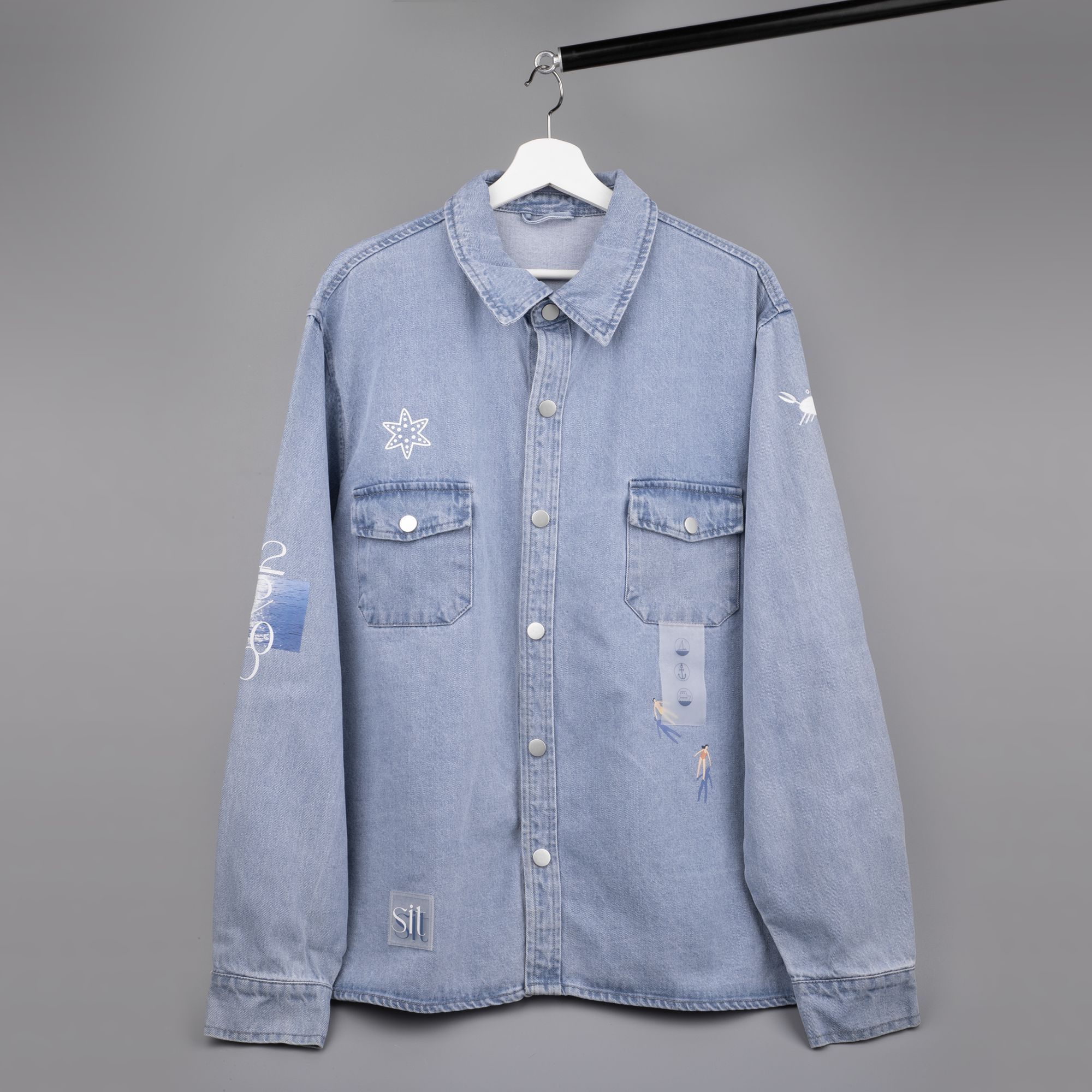 Джинсовая куртка-рубашка унисекс на кнопках прямого силуэта.