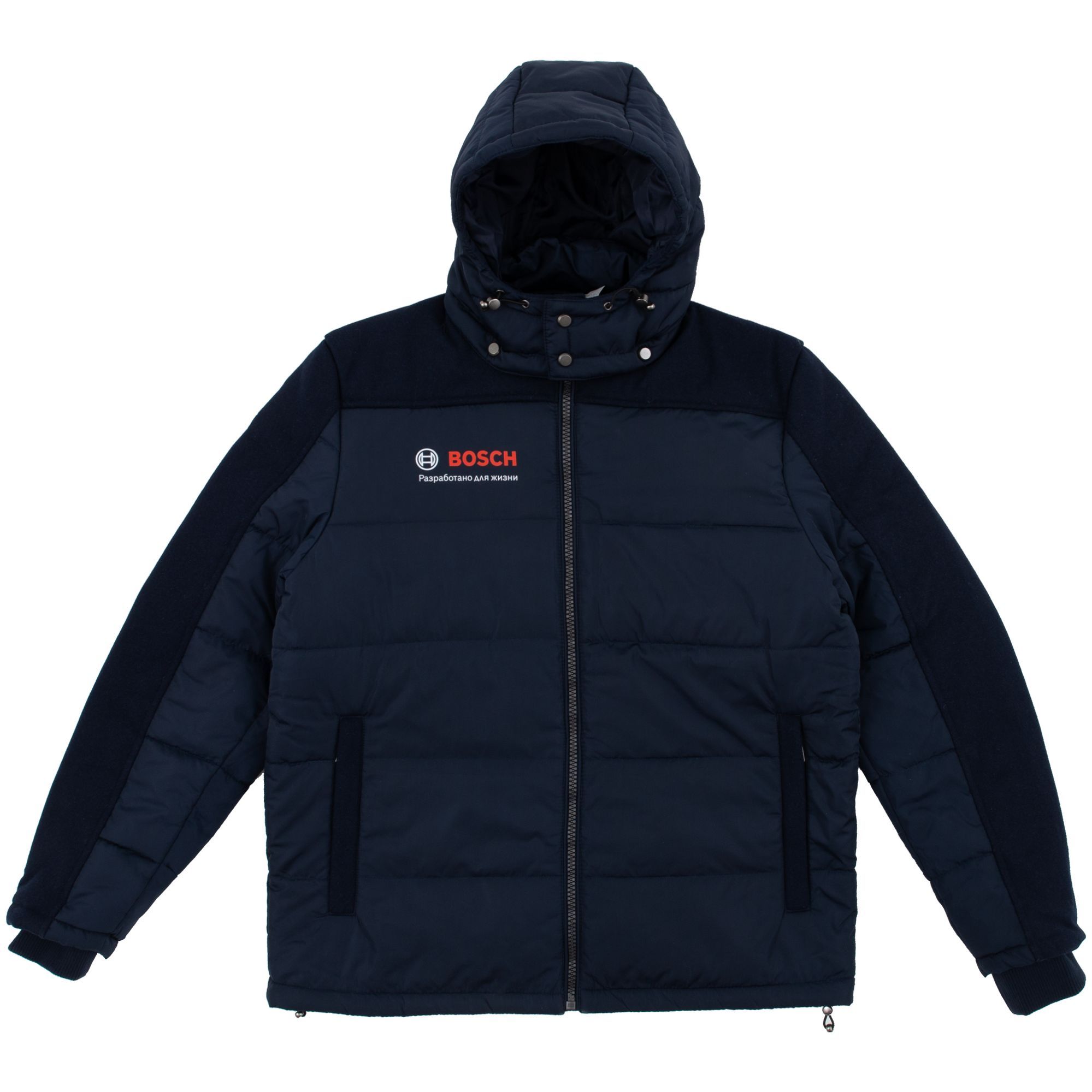 подкладка - полиэстер 100%, 210Т; набивка - полиэстер 100%, плотность 200 г/м²; кокетка и вставка на рукавах: 57% - шерсть, 34% - полиэстер, 5% - акрил, 4% - нейлон; полиуретановая пропитка; верх - полиэстер 100%