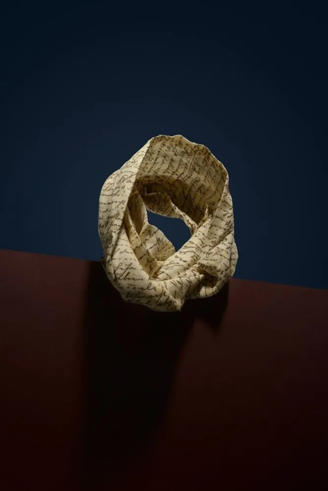 Шарф-снуд сшит по принципу ленты Мебиуса: перекрученное замкнутое кольцо. Именно поэтому он ложится на плечи красивыми складками.
