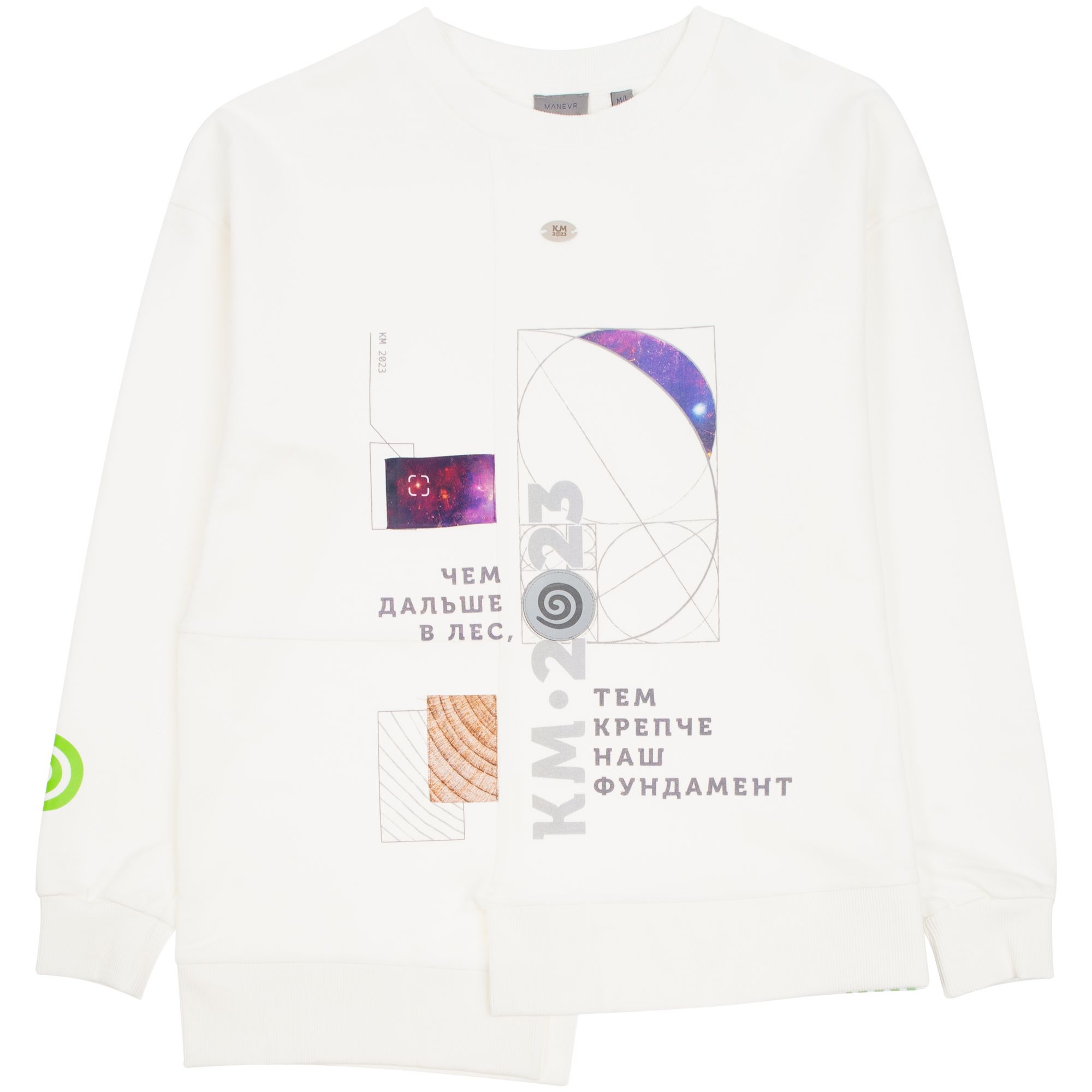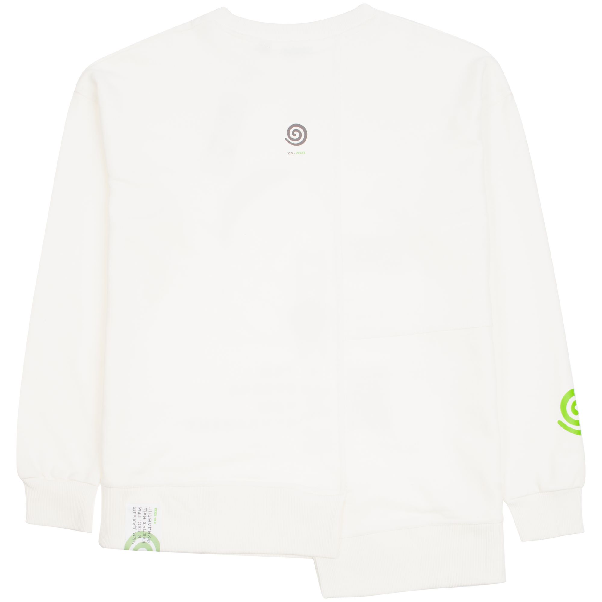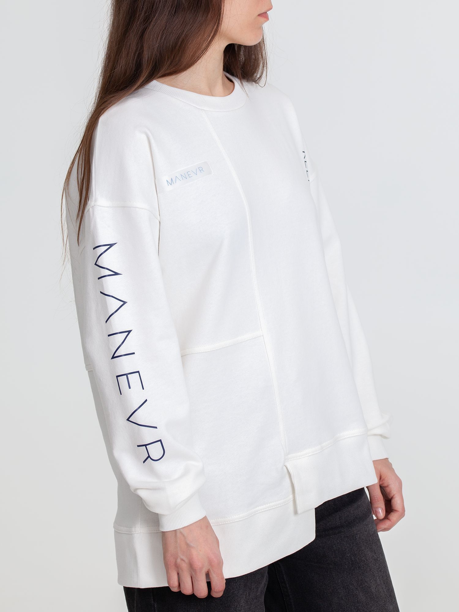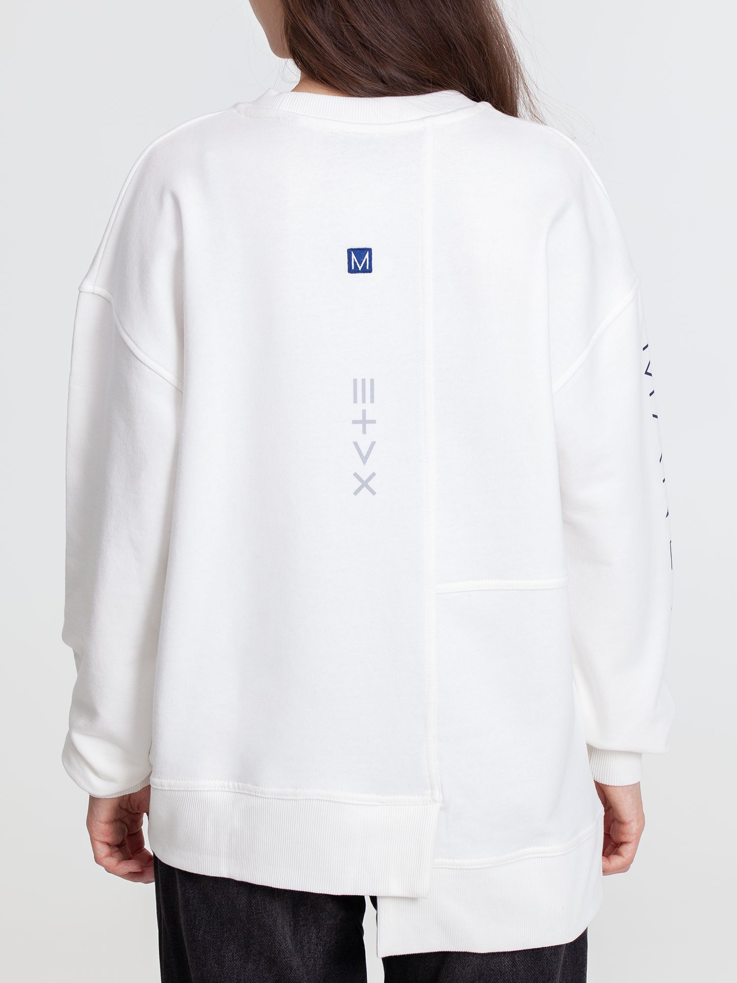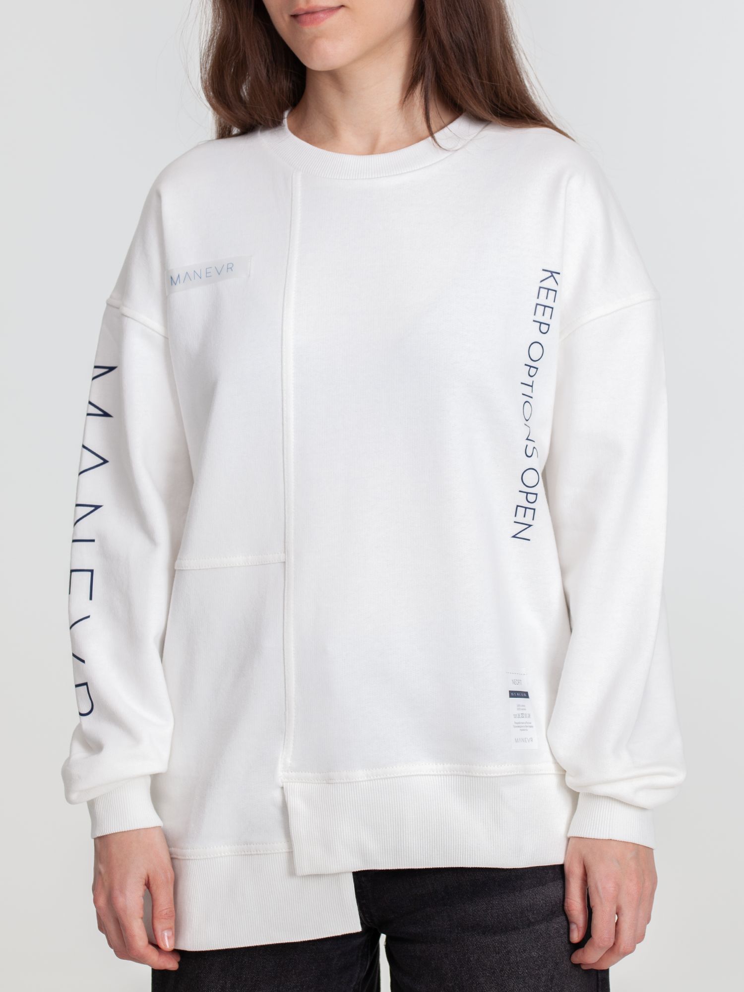 Свитшот унисекс свободного кроя со спущенным плечом и нестандартным нижним краем.
