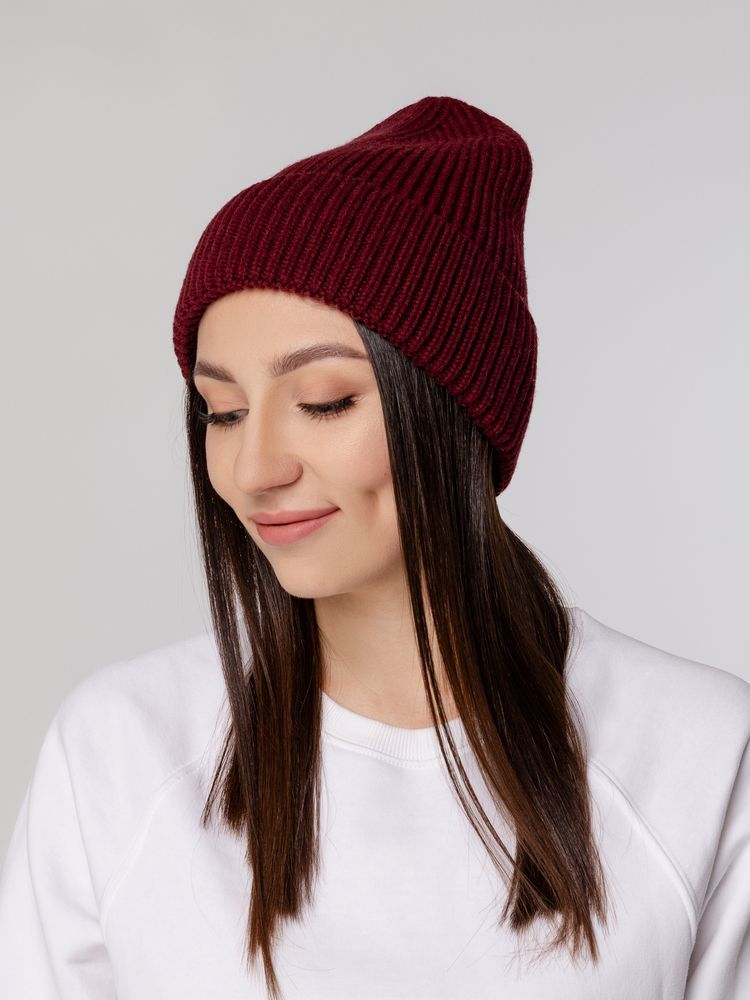 Однослойная шапка рельефной вязки с отворотом.