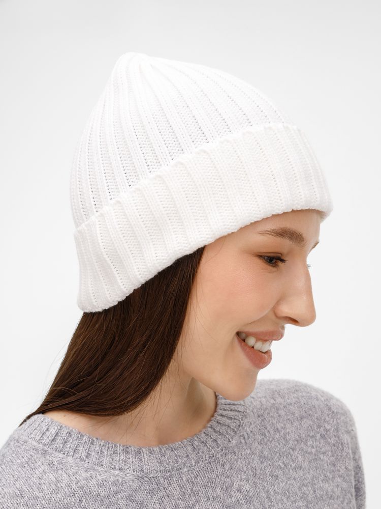 Однослойная шапка рельефной вязки с отворотом.
