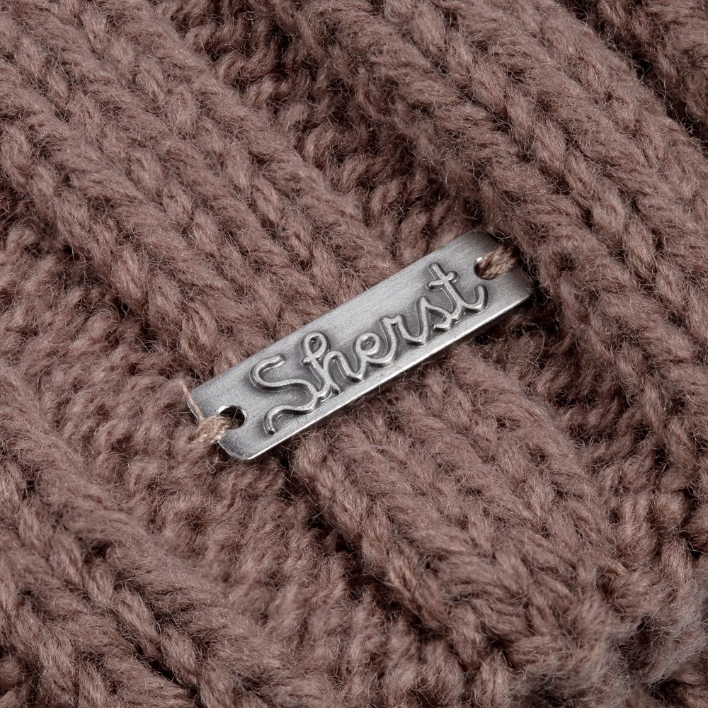 Металлический шильд с названием бренда расположен у заднего шва шапки. Это оставляет место спереди для пришива лейбла или шильдика с логотипом заказчика.