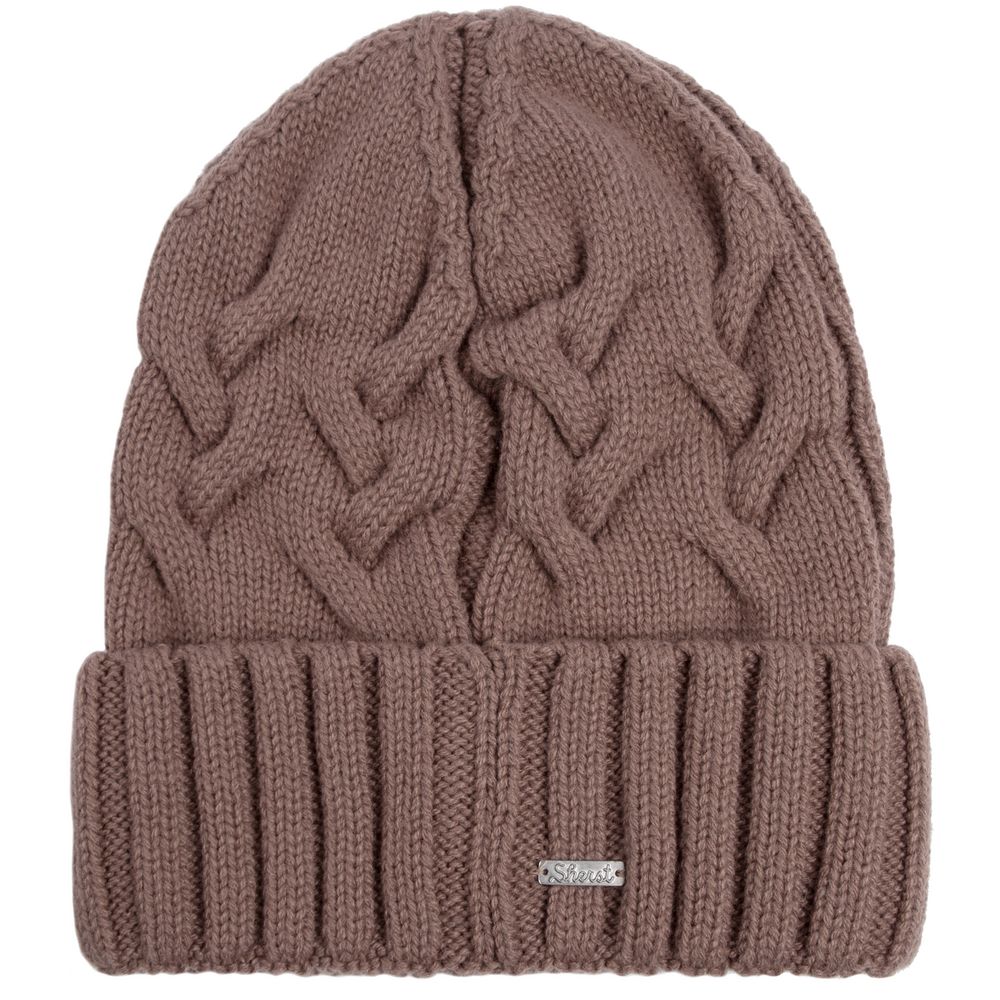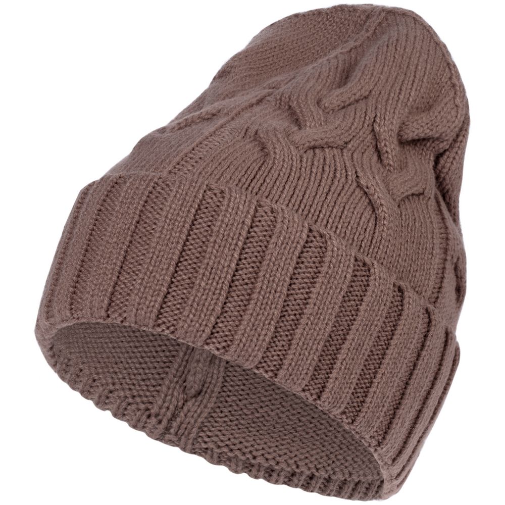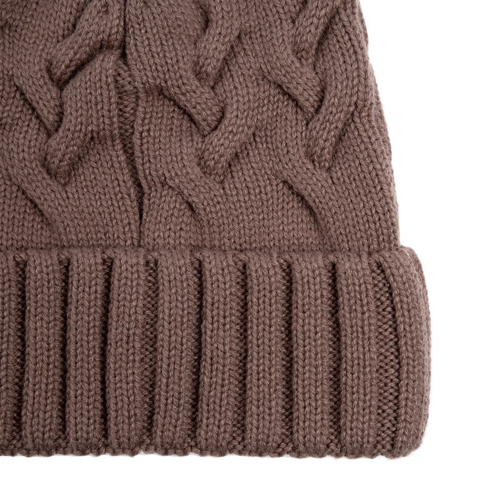 Однослойная шапка фактурной вязки с объемными косами и рельефным отворотом.