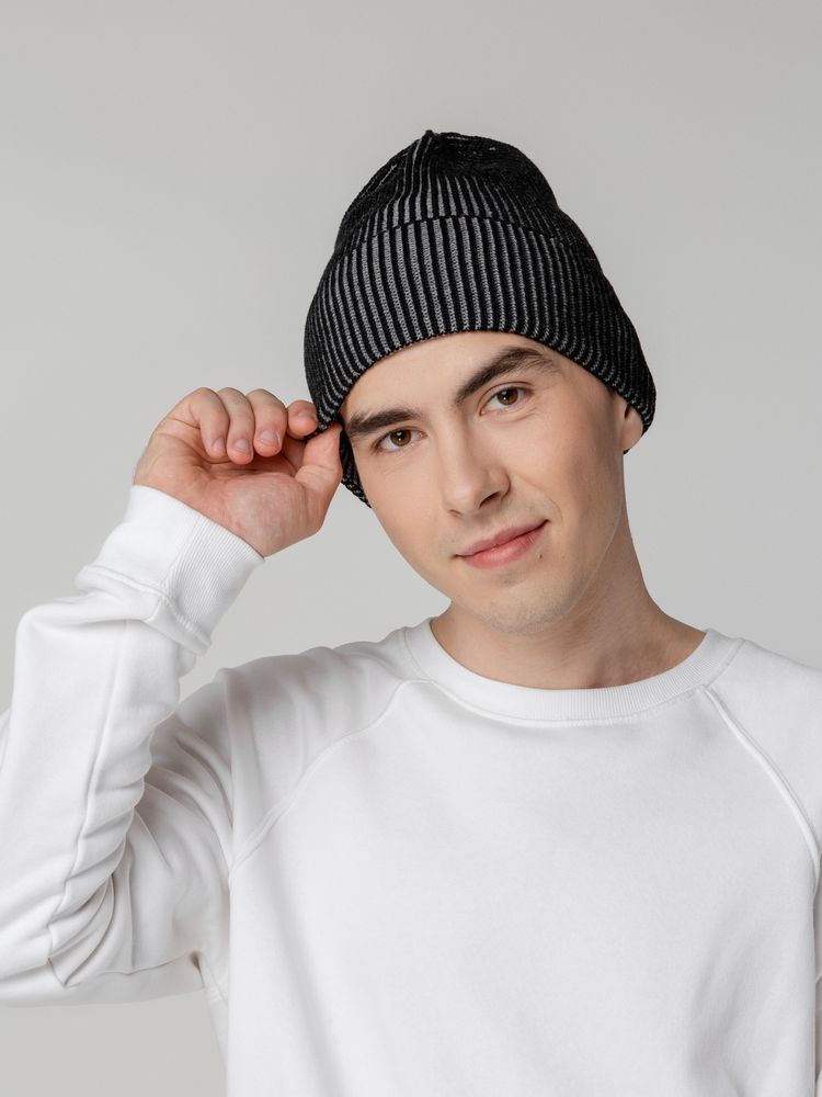 Удлиненная двухцветная шапка из полушерстяной пряжи идеально подходит для создания яркого и современного городского образа и будет удачно смотреться с верхней одеждой разных стилей.