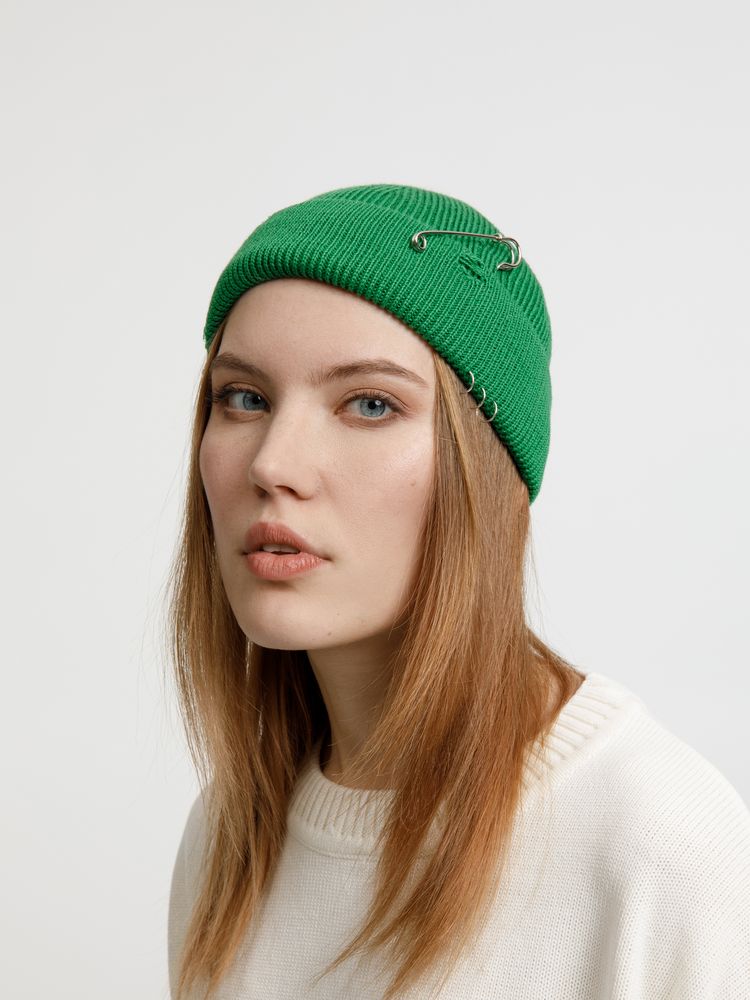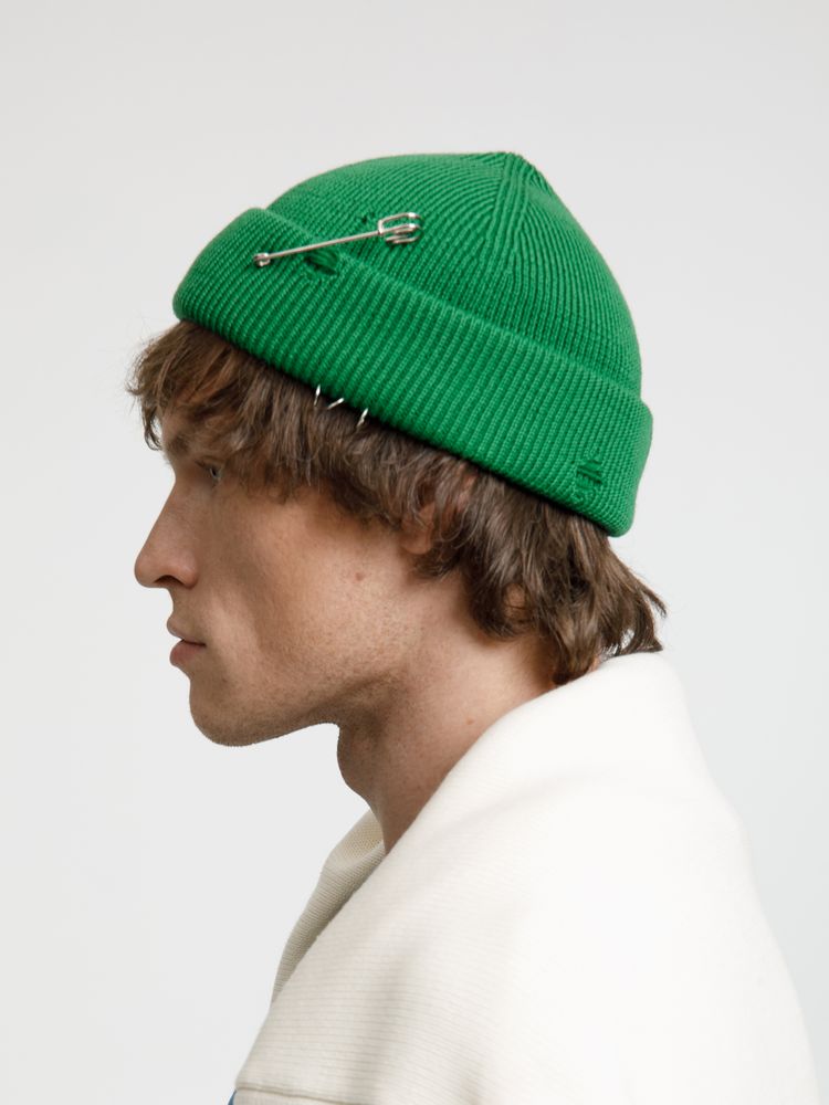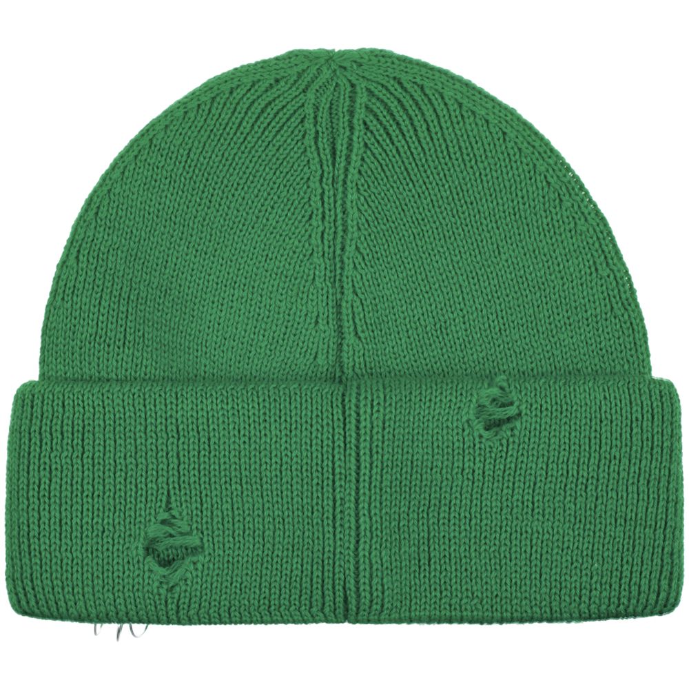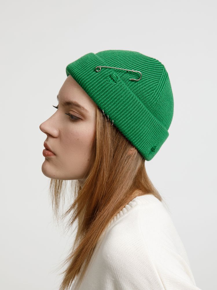 Однослойная шапка бини с рваным отворотом и металлическими аксессуарами для дерзких образов в любом возрасте. Яркий и запоминающийся акцент в стиле гранж.