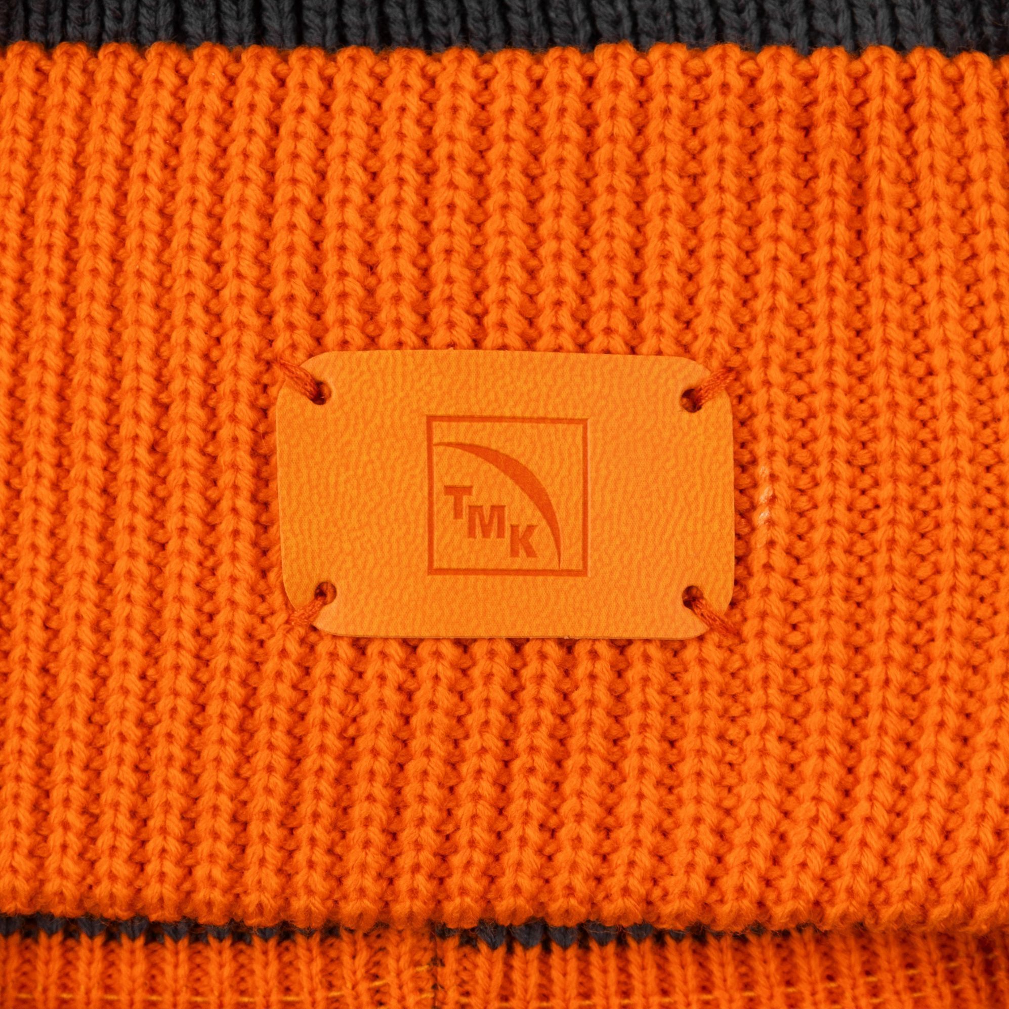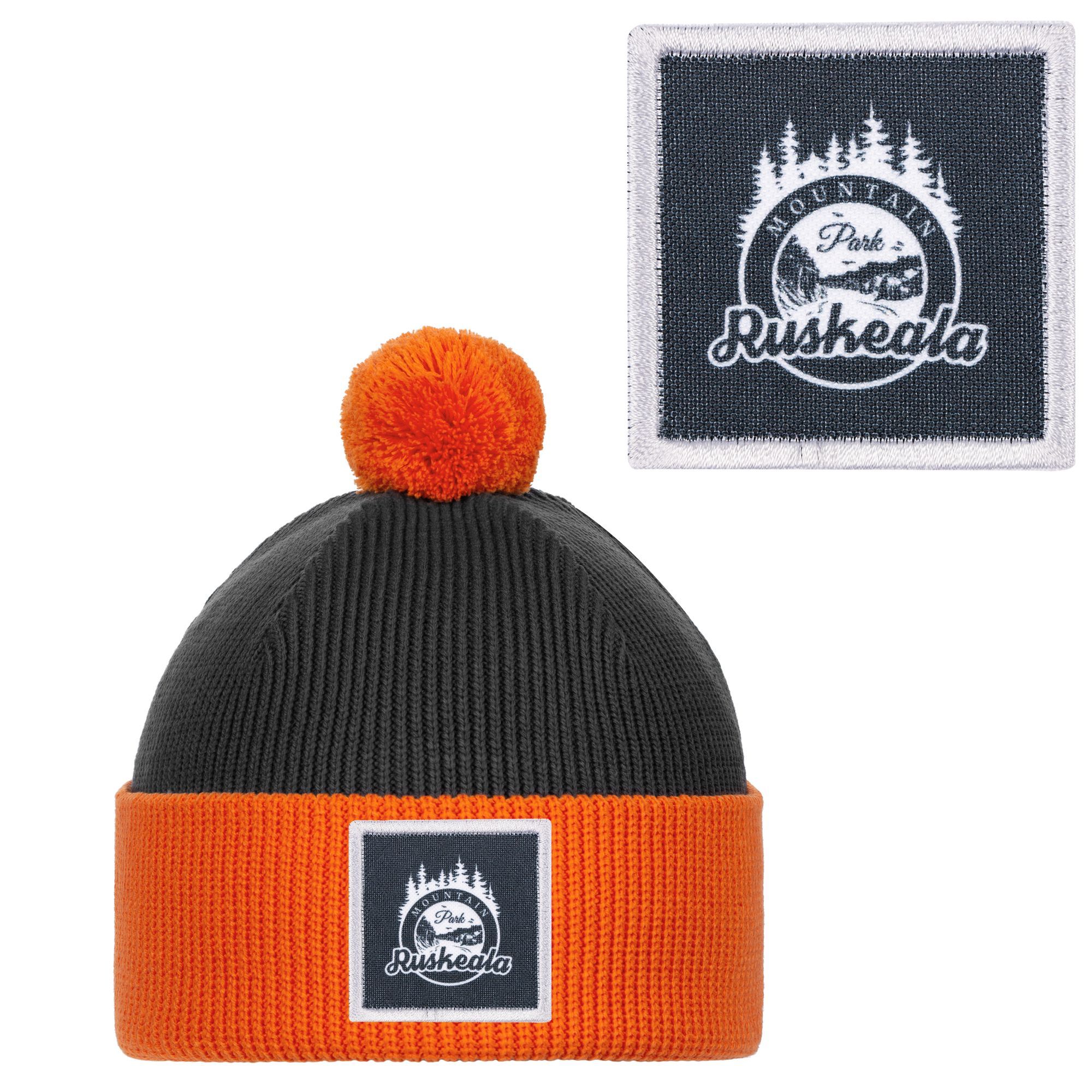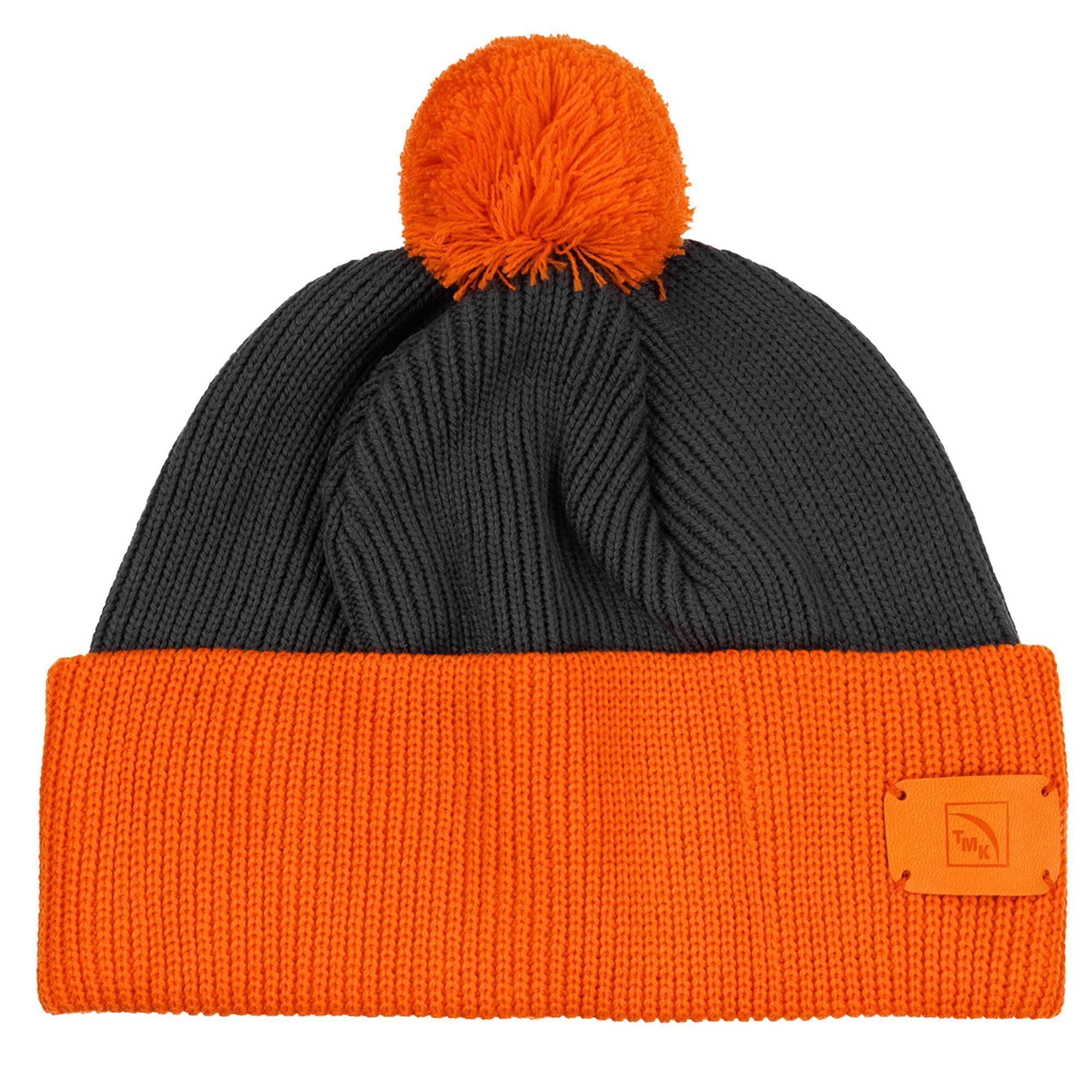Двуслойная шапка фактурной вязки с контрастным подворотом и помпоном.