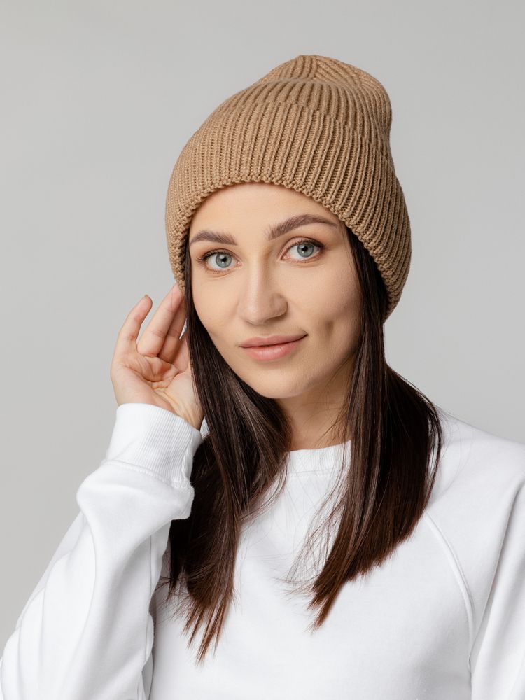 Шапка-бини из полушерстяной пряжи актуальных приглушенных оттенков. Трендовый фасон с удлиненным верхом — для расслабленного повседневного образа.
