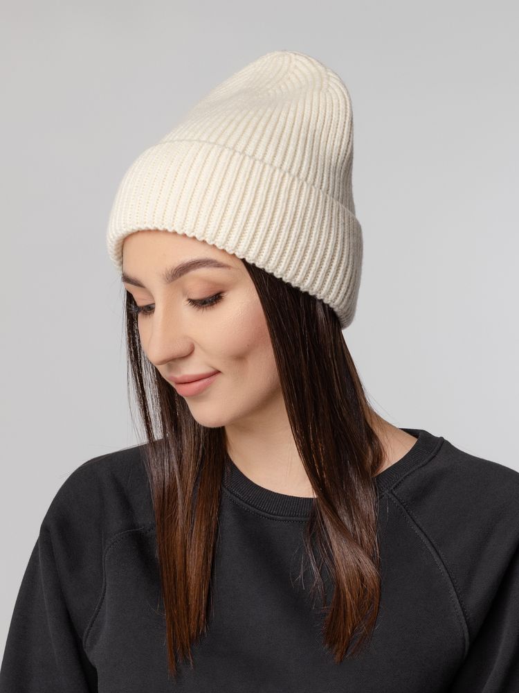 Шапка-бини из полушерстяной пряжи актуальных приглушенных оттенков. Трендовый фасон с удлиненным верхом — для расслабленного повседневного образа.