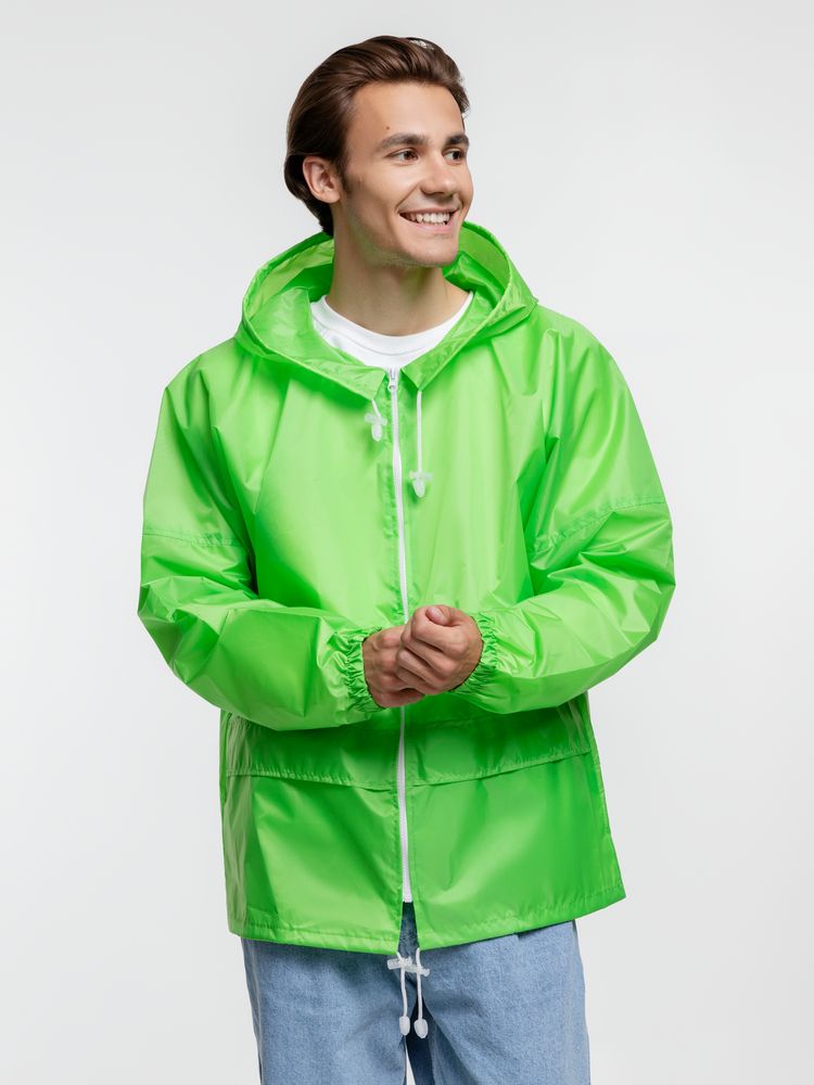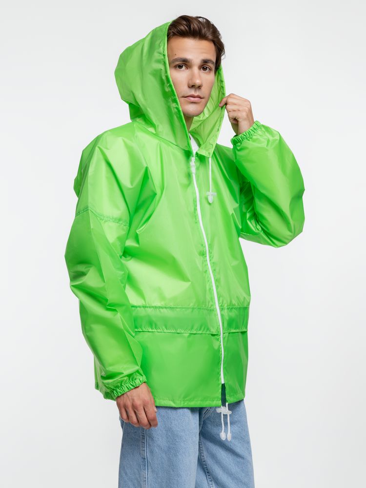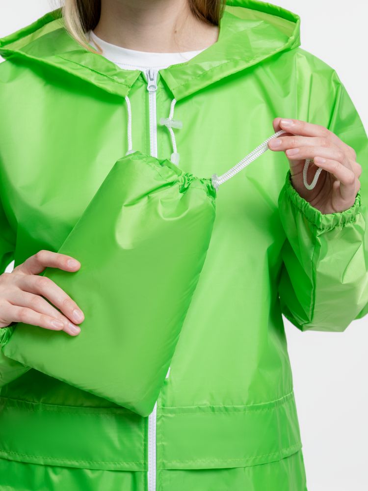 Укороченный дождевик свободного кроя из ткани таффета с влагозащитным покрытием. Складывается в мешочек — удобно брать с собой.