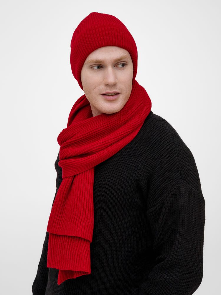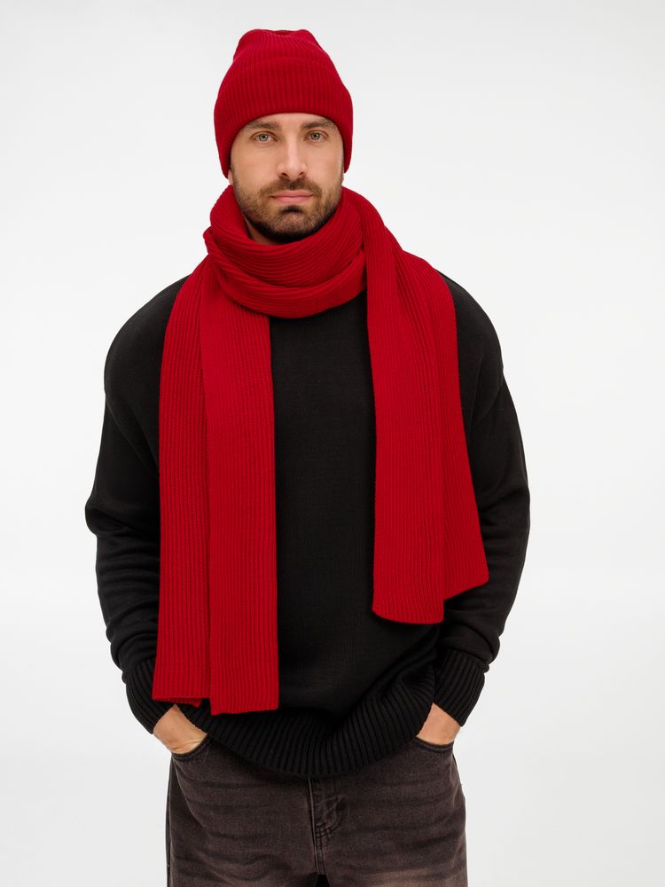 Удлиненная шапка с широким отворотом и фактурной вязкой мягко облегает голову, создавая элегантный силуэт. Широкий шарф с выразительным рельефом позволяет экспериментировать с драпировками, добавляя образу объем и динамику. Перчатки с аккуратной резинкой на манжете обеспечивают идеальную посадку и тактильный комфорт.