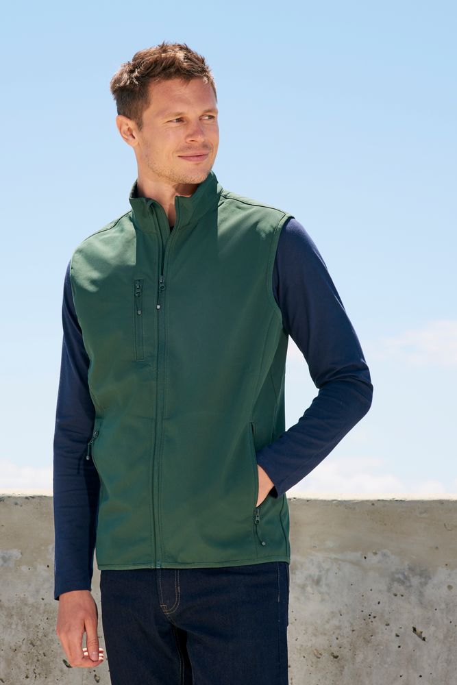 Мужской водонепроницаемый и ветрозащитный жилет на молнии из трехслойного софтшелла с флисовой изнанкой. Выполнен из переработанного полиэстера.
