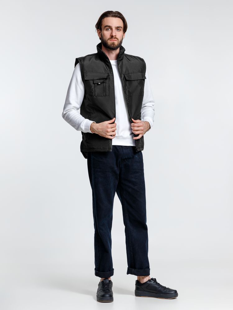 Мужской утепленный жилет с воротником-стойкой и удлиненной спинкой. Выполнен из ткани оксфорд с водоотталкивающим покрытием.