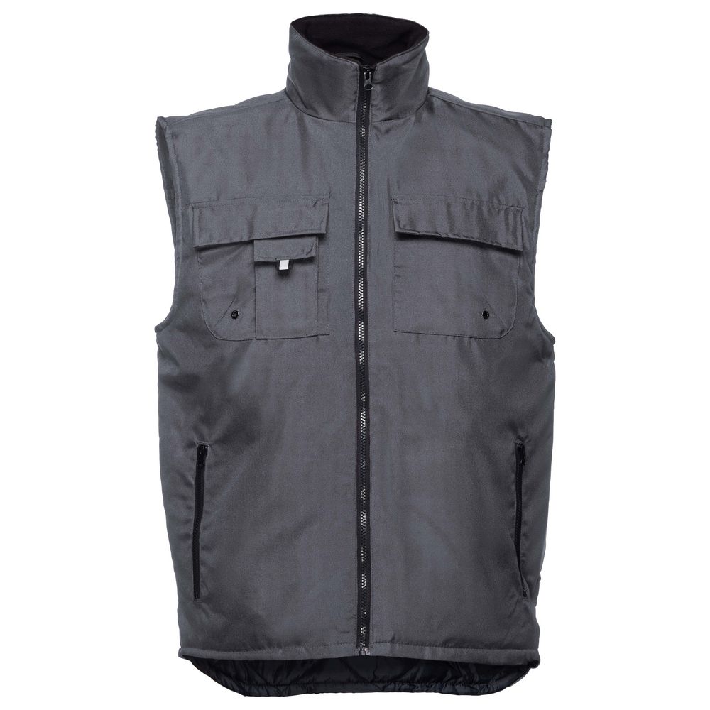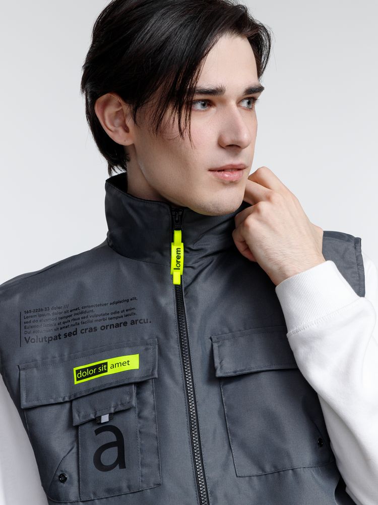 Мужской утепленный жилет с воротником-стойкой и удлиненной спинкой. Выполнен из ткани оксфорд с водоотталкивающим покрытием.