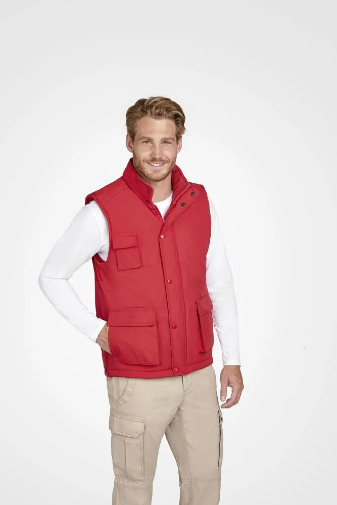 Два кармана спереди для рук, два кармана на груди для мобильного телефона, ручек и прочих мелочей, а также внутренний карман. Внутренний стягивающий шнур на талии. Эластичные плечики от ветра. Две молнии по бокам внизу для большей легкости движения, одна внутренняя молния на груди и одна — внизу жилета.