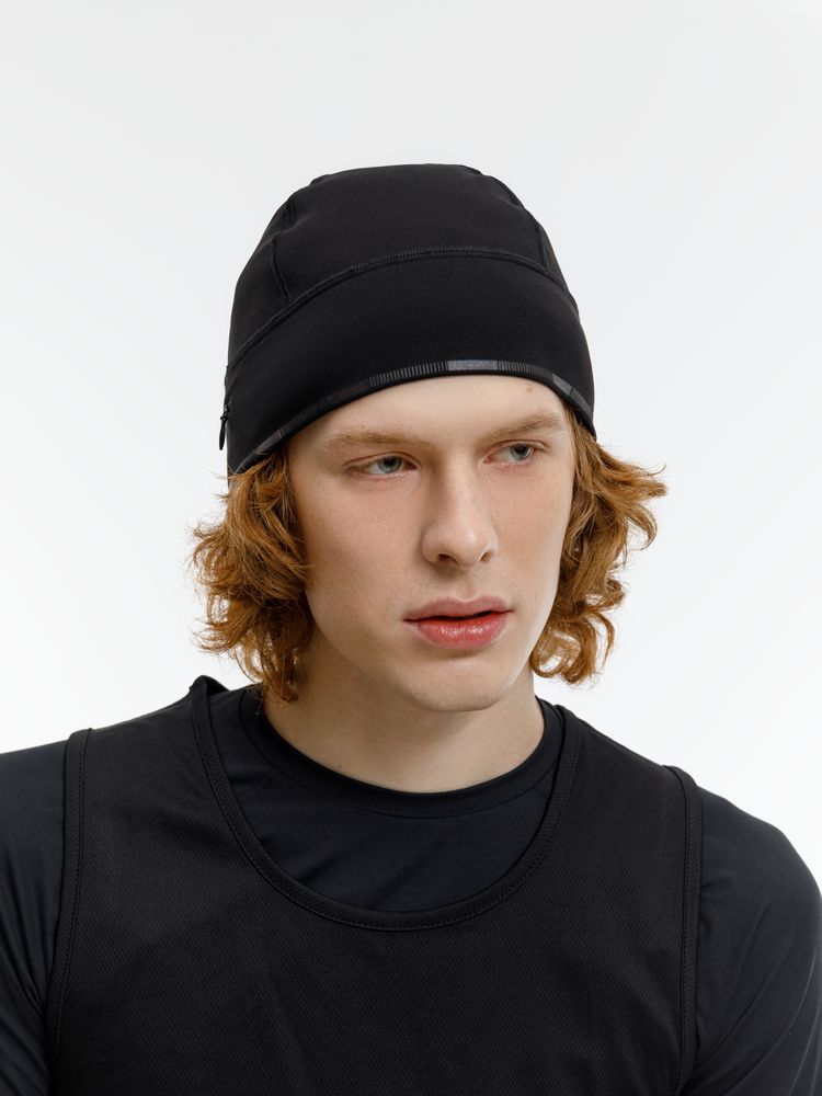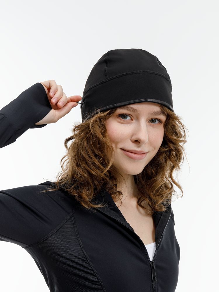Шапка выполнена в черном цвете, но имеет светоотражающую полосу вдоль края, что улучшает видимость спортсмена в условиях плохой освещенности.