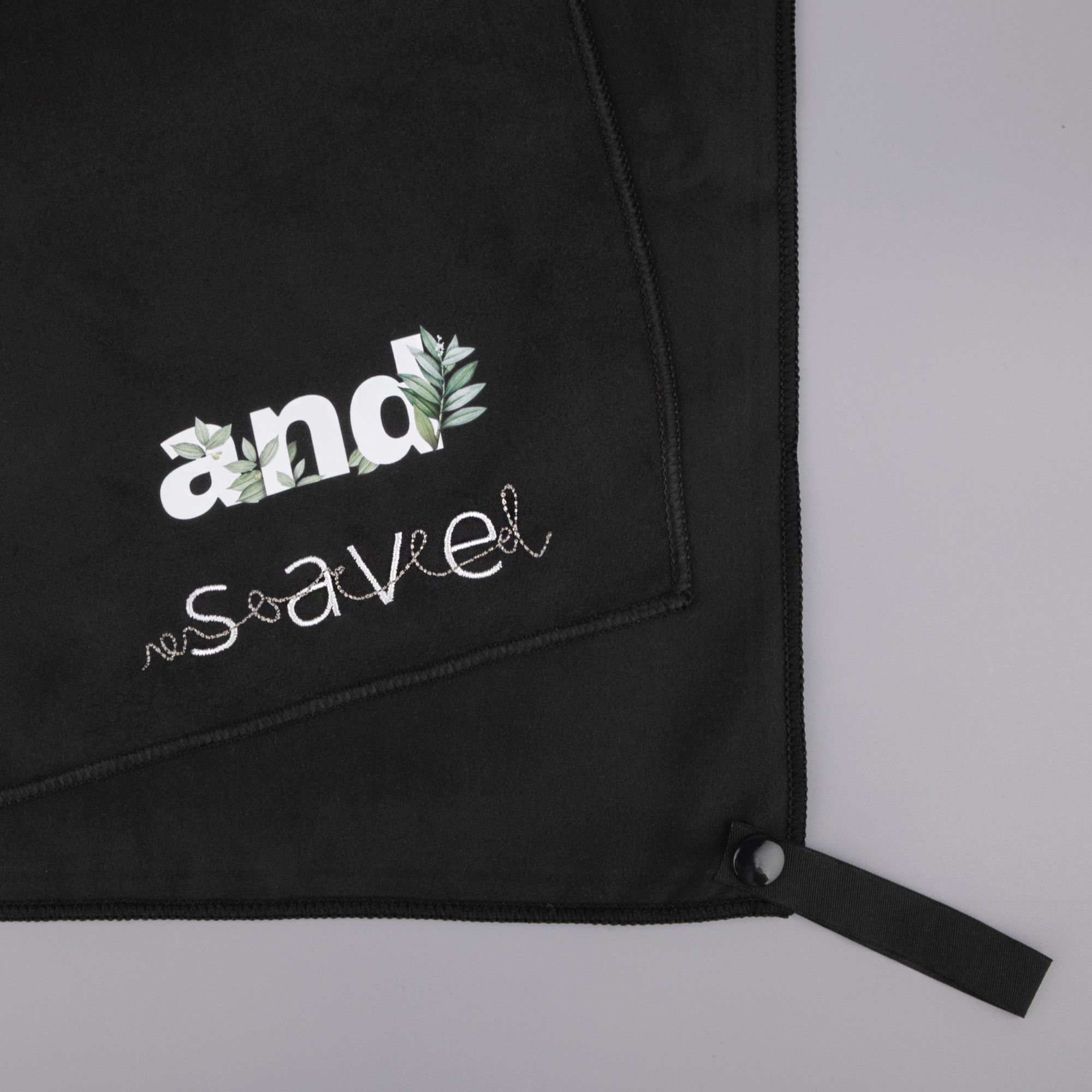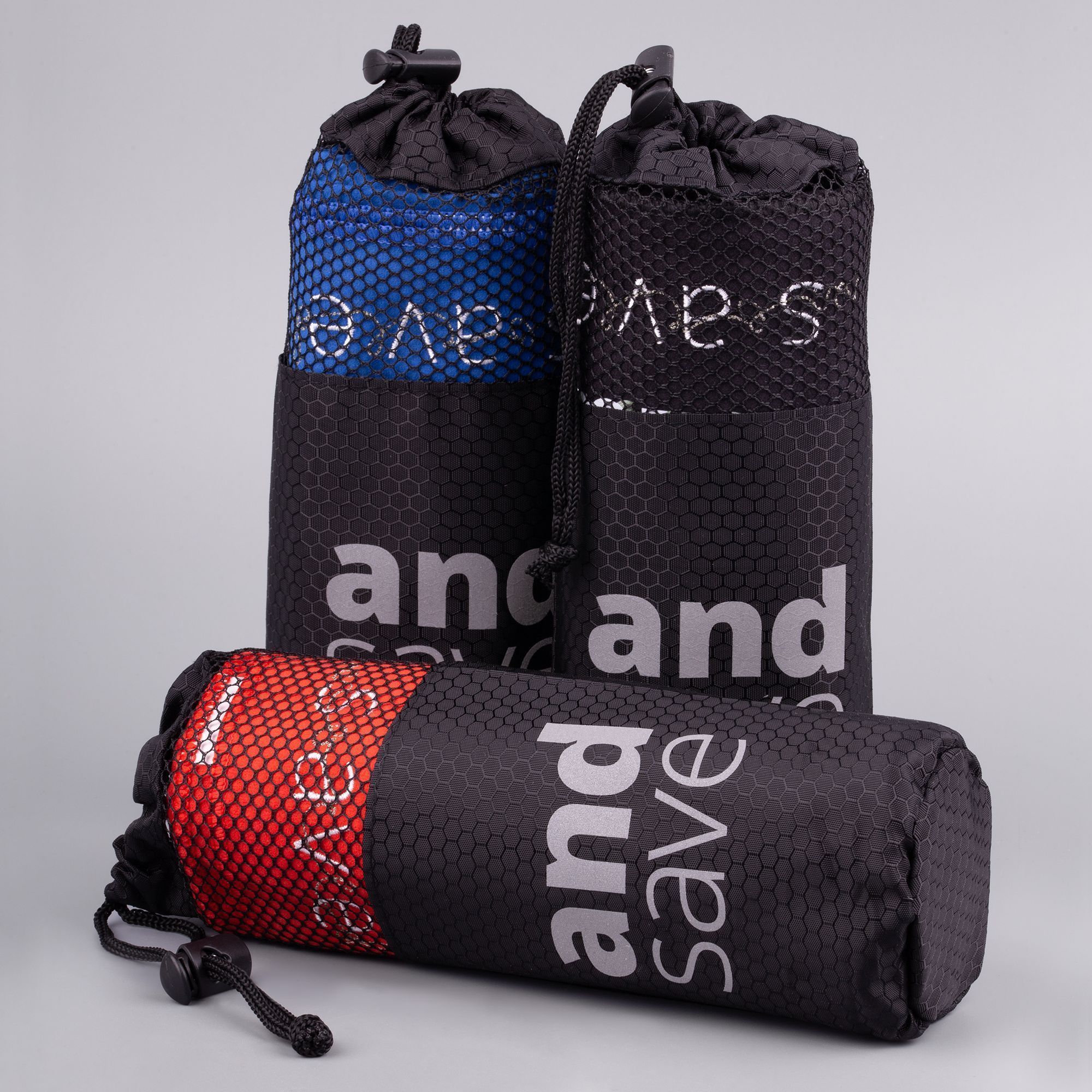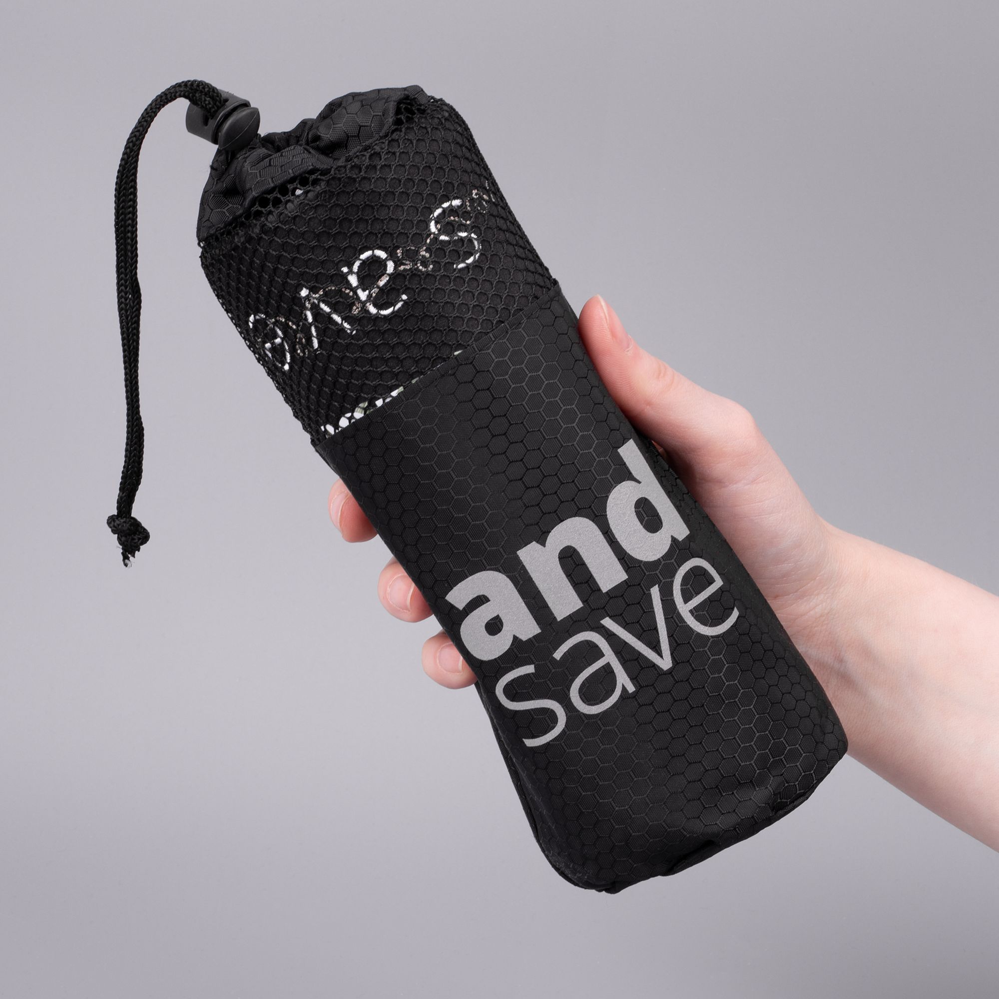 Полотенце упаковано в сумку-чехол из прочной ткани с плетением рипстоп и дышащим сетчатым верхом. Чехол также можно использовать в качестве несессера для косметических и купальных принадлежностей.