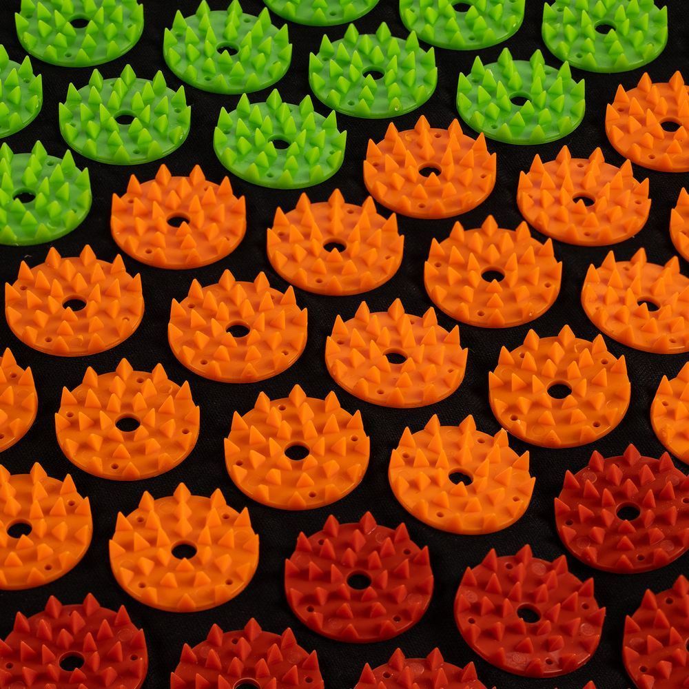 - На поверхности коврика расположены 230 массажных шипа, на подушке — 66;