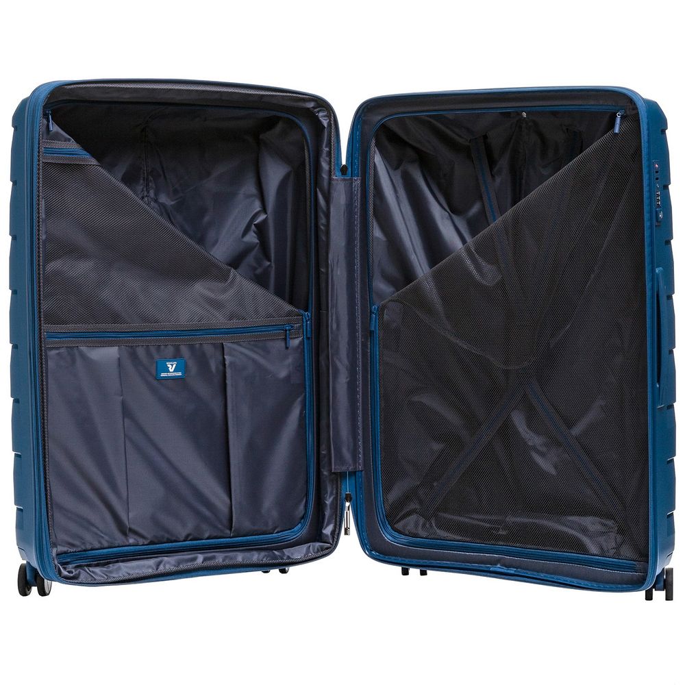 - Чемодан с 2 отделениями: одно из них с фиксирующими ремнями и сетчатой шторкой на молнии, второе — с разделителем на молнии