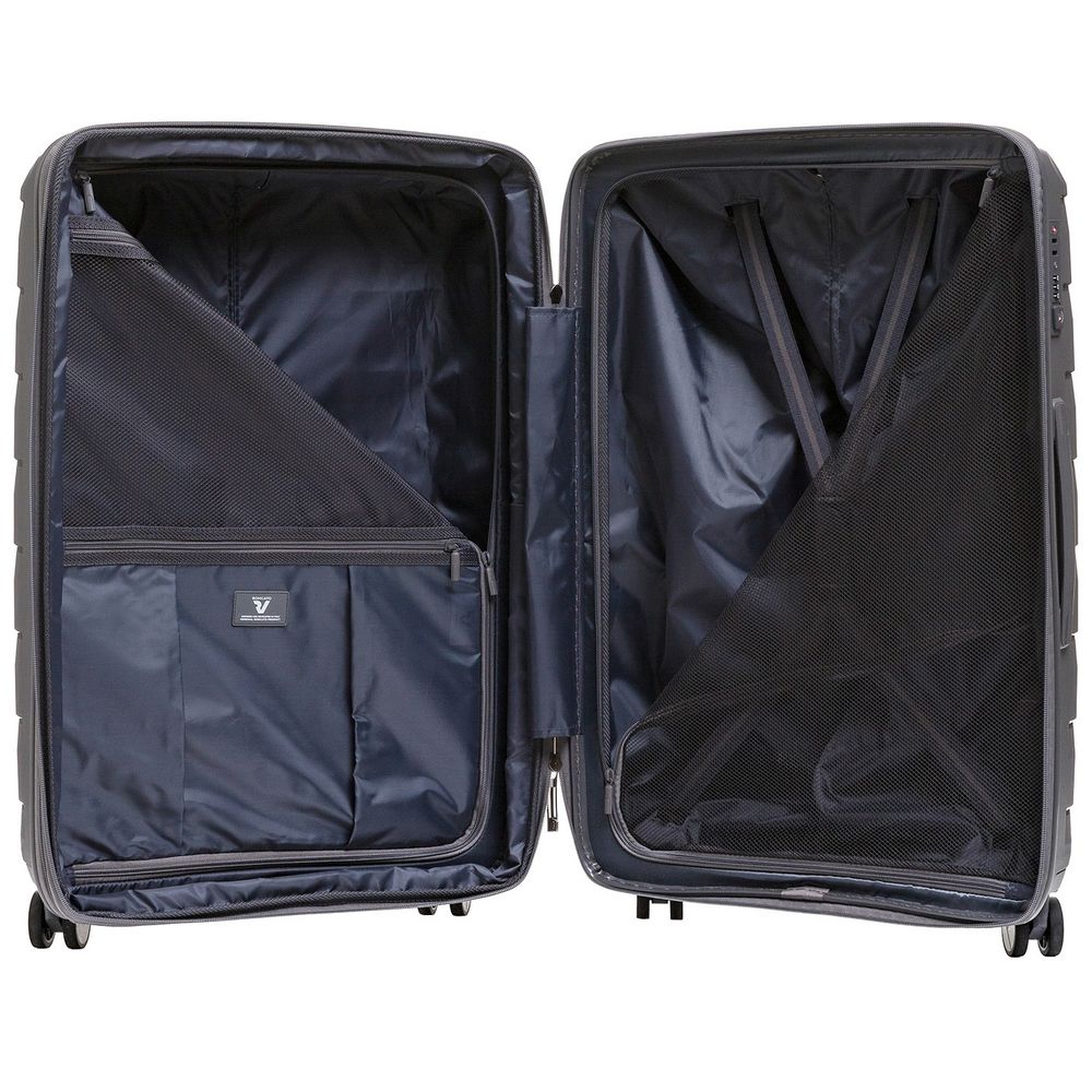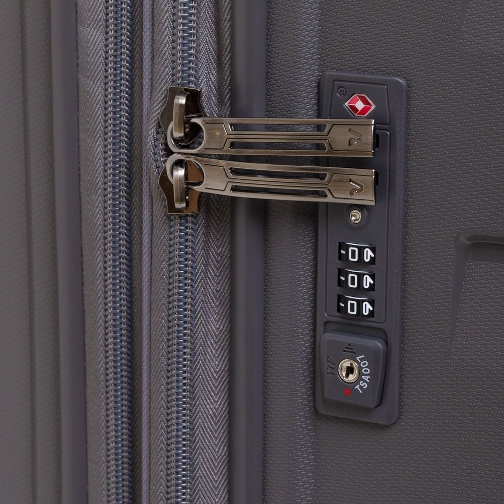 - Чемодан с 2 отделениями: одно из них с фиксирующими ремнями и сетчатой шторкой на молнии, второе — с разделителем на молнии