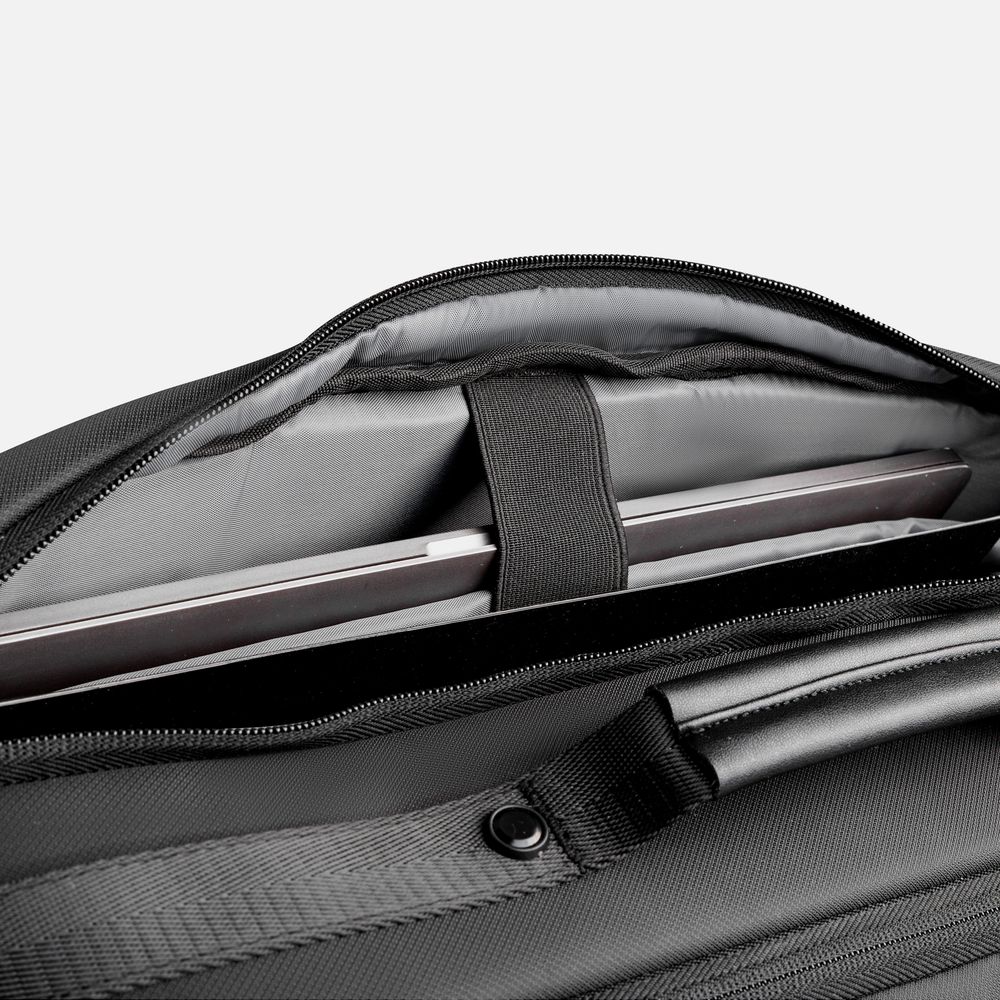 - Два отделения на молнии: первое — для документов с усиленным карманом под ноутбук, второе — объемное отделение для вещей с панелью‑органайзером и внутренним карманом на молнии