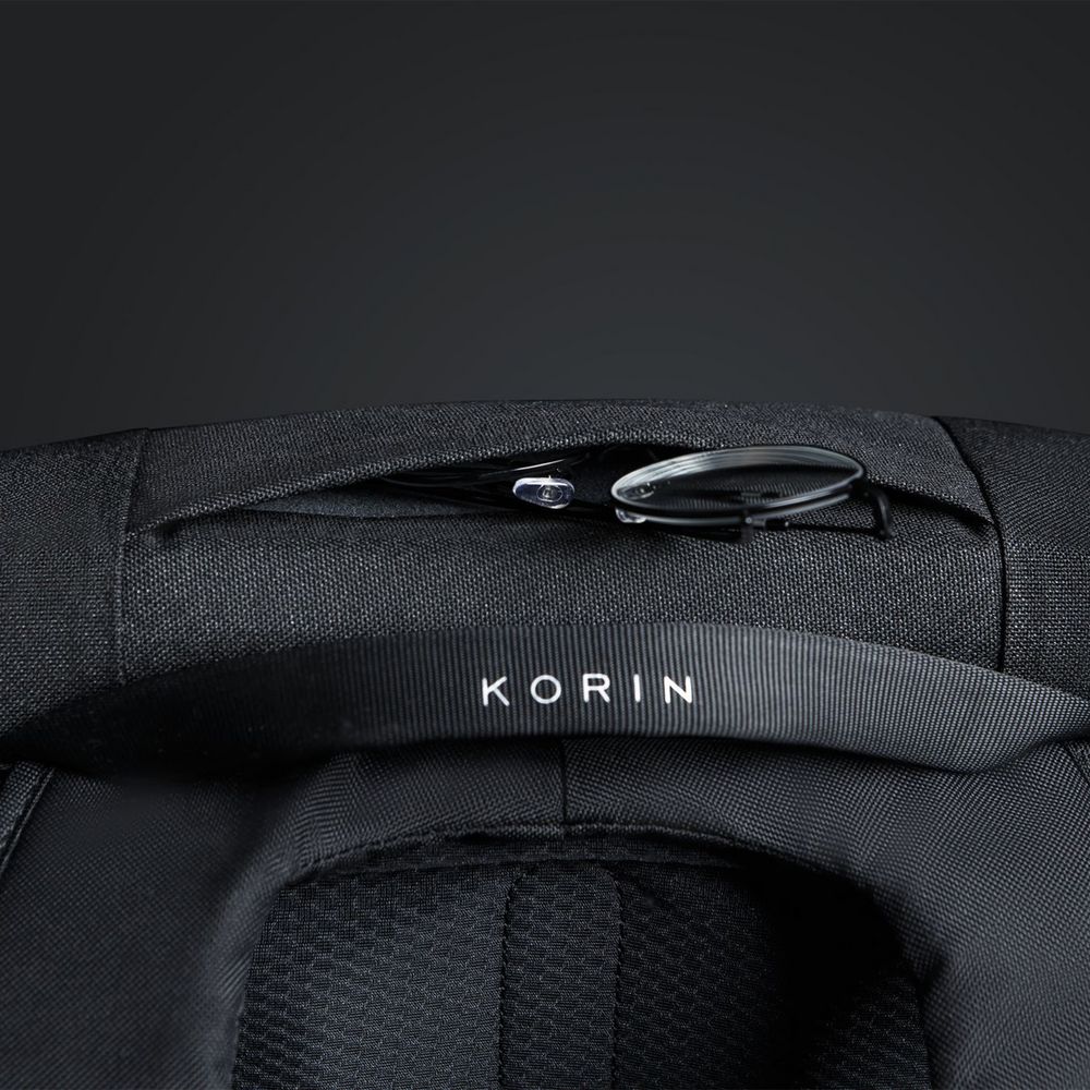 - На правой лямке рюкзака находится USB-порт, на левой — карман на липучке с двумя отделениями с RFID-защитой для карточек и ключей