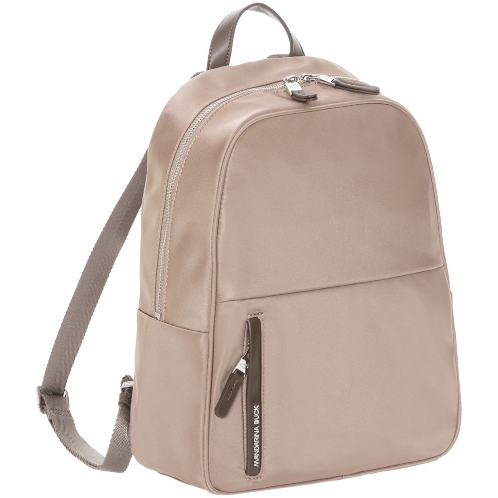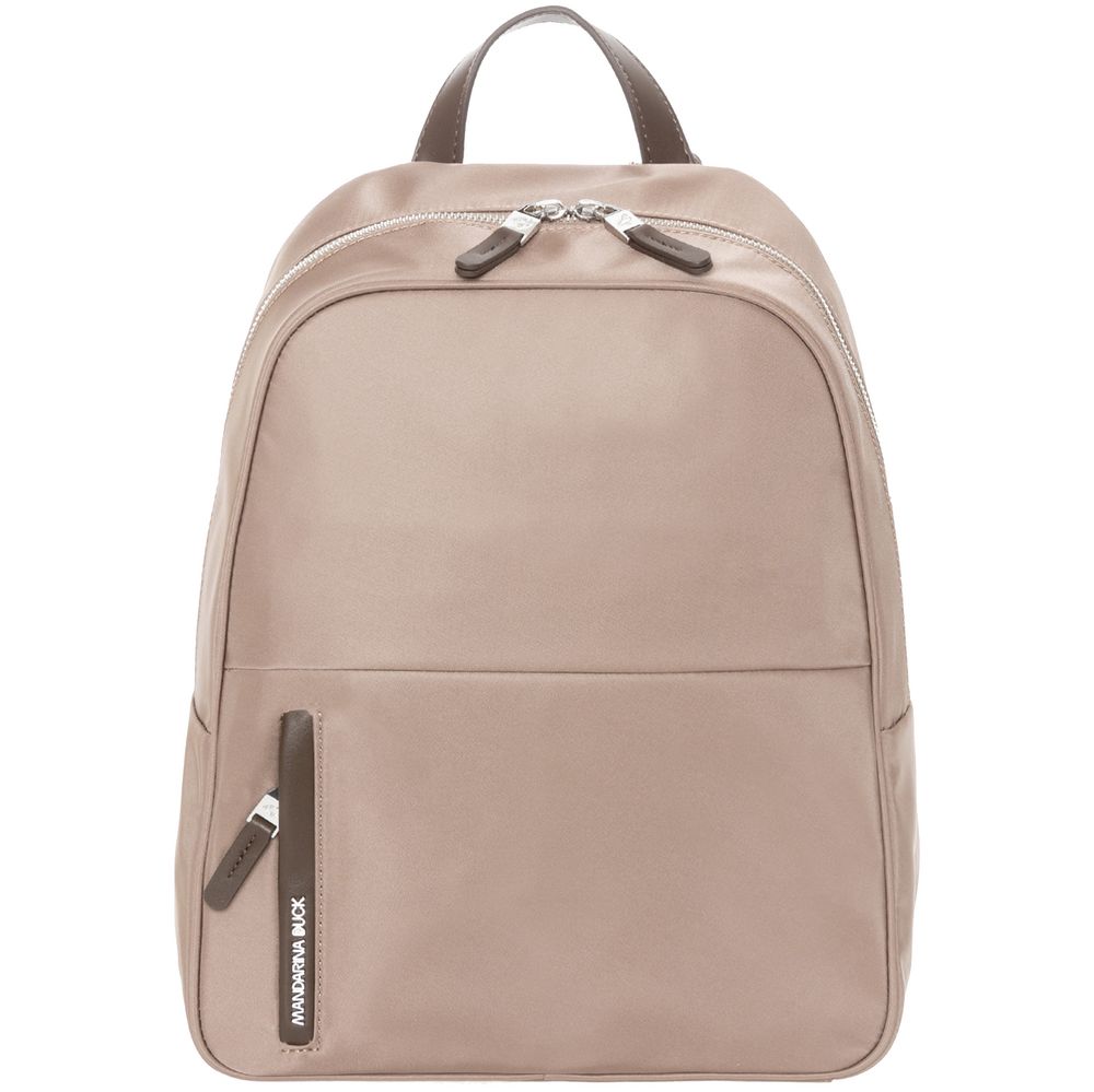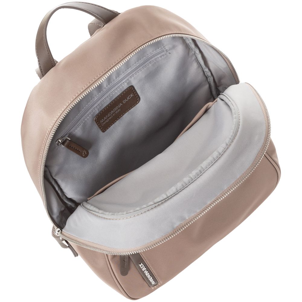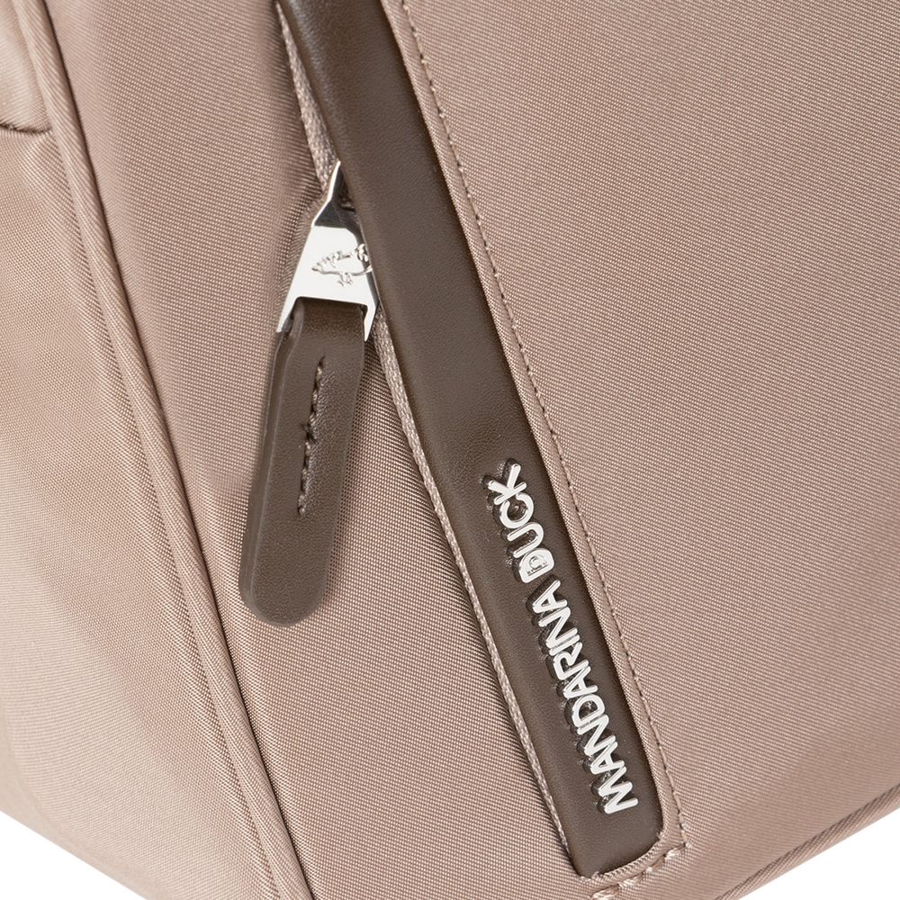 Изготовлен из гладкого влагостойкого нейлона, а также дополнен привлекательной фурнитурой из экокожи и металлизированным логотипом бренда.