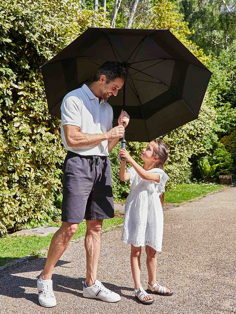 Двойная конструкция купола уменьшает парусность зонта и помогает уверенно удерживать его при сильных порывах ветра, а ручка с покрытием софт-тач не скользит в руке. В закрытом виде зонт фиксируется двумя хлястиками с липучками, а спицы заправляются под специальное подвижное кольцо.