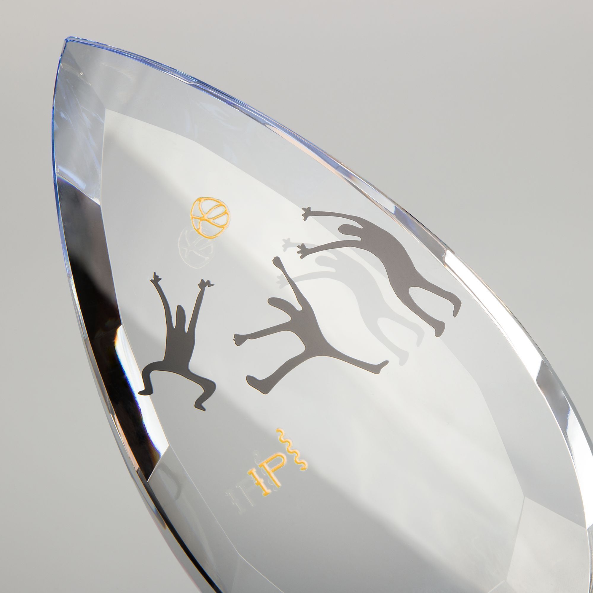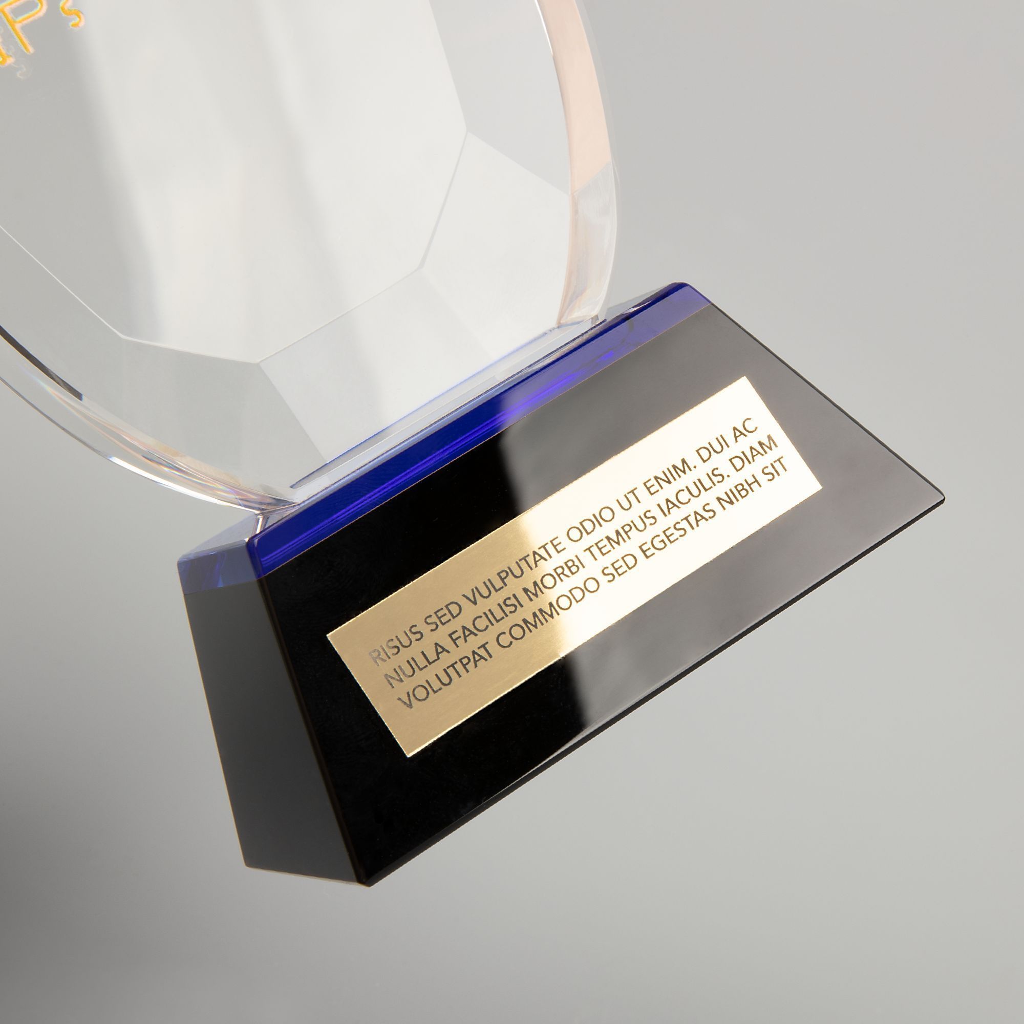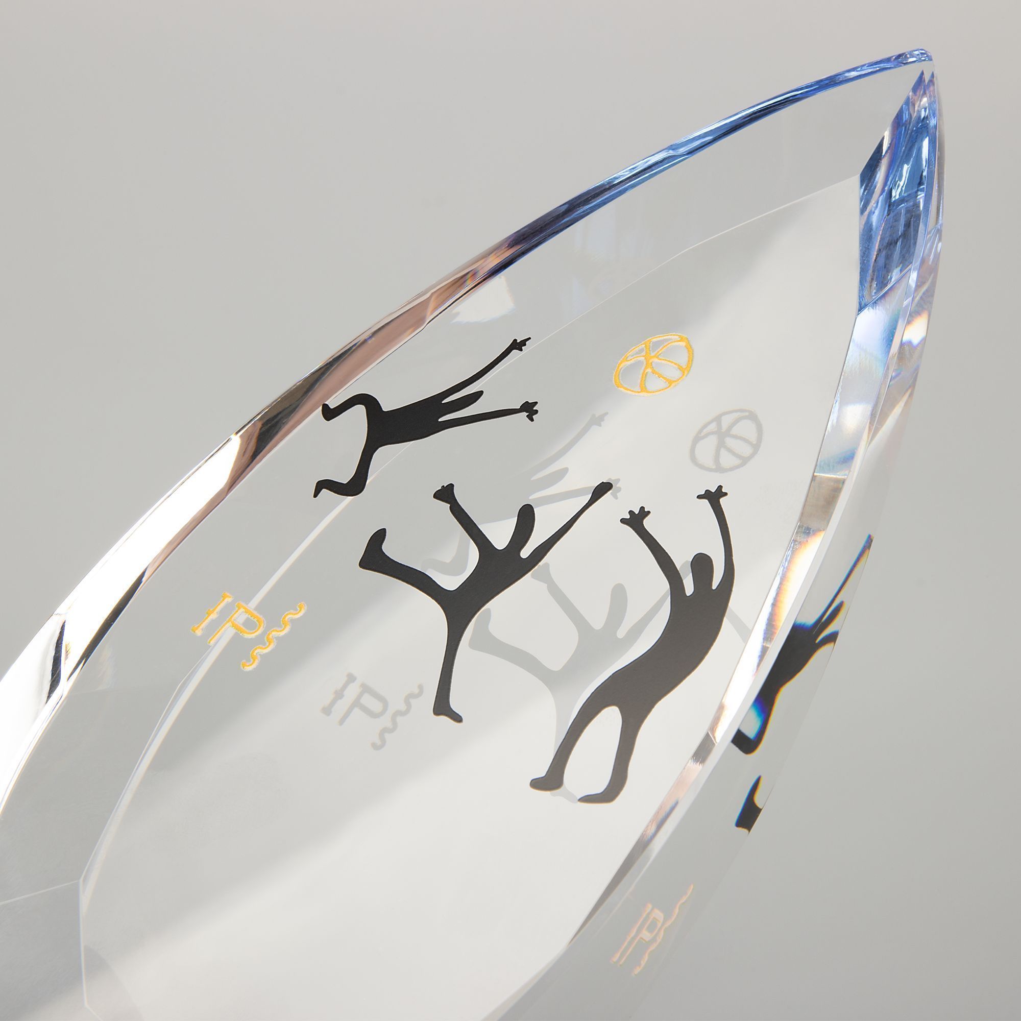 Стела изготовлена из стекла К9, в основе которого лежит оптическое боросиликатное стекло. Эту марку стекла отличает низкий процент посторонних включений, высокий показатель преломления и высокая прозрачность — идеальные качества для изготовления наград премиального уровня.