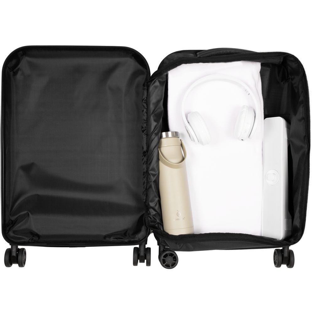 Для изготовления корпуса использован ударопрочный АБС-пластик последнего поколения, а расширение чемодана сделано из очень плотной водонепроницаемой ткани, которая идеально подходит для эффектных принтов больших размеров.