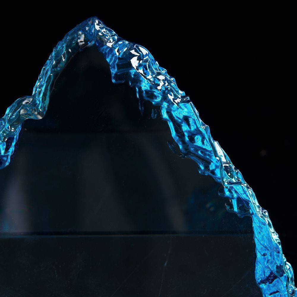 Необычная форма стелы, похожая на живописный горный хребет, символична и будет напоминать о покоренных высотах, вдохновляя на новые свершения. Эффект заснеженной вершины дополнительно усиливается благодаря голубоватому цвету.
