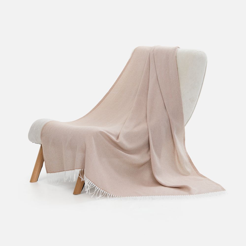Классический рисунок «елочка» не слишком привлекает внимание, но в то же время добавляет изюминки. Смешанный состав пряжи продлевает срок службы и существенно облегчает уход за пледом.