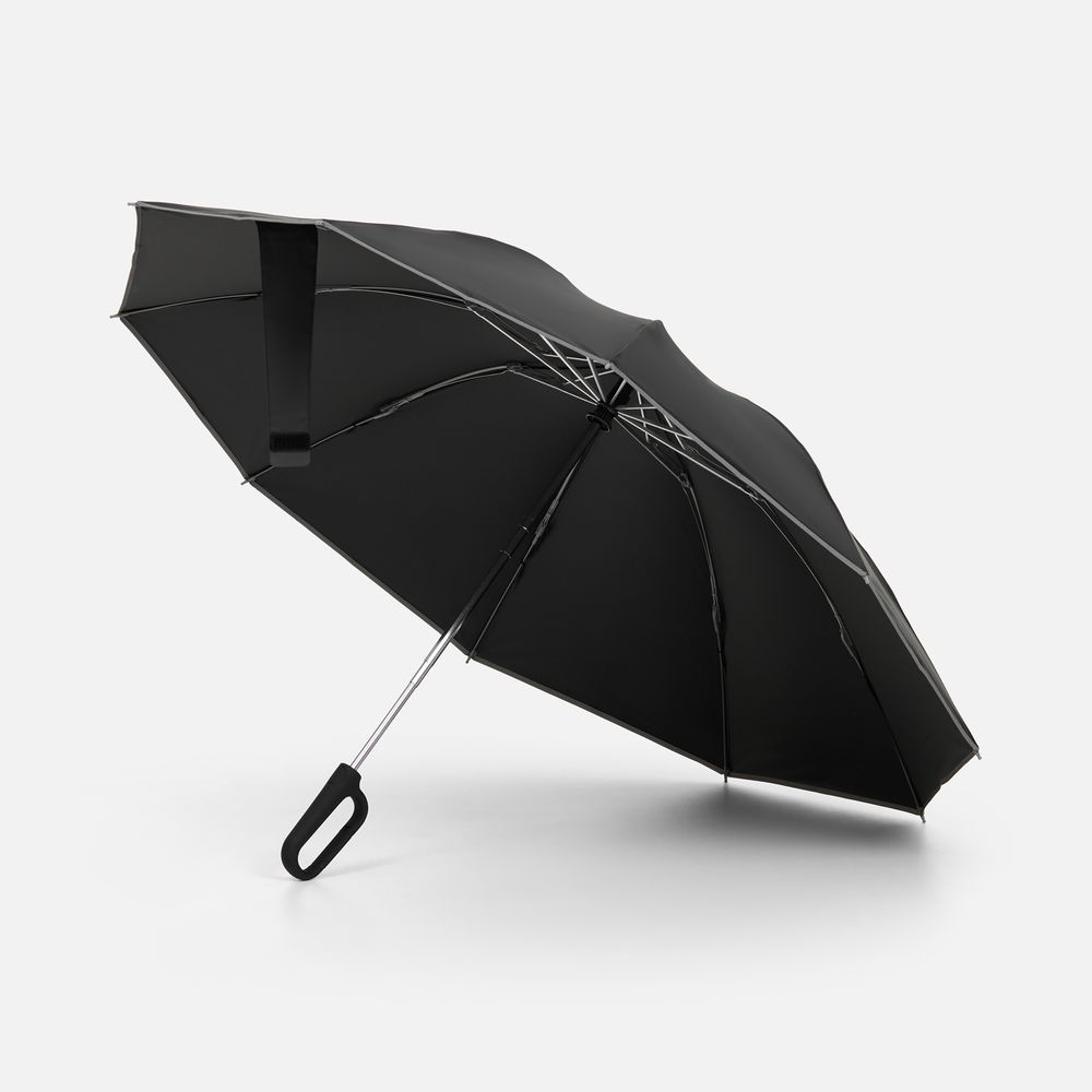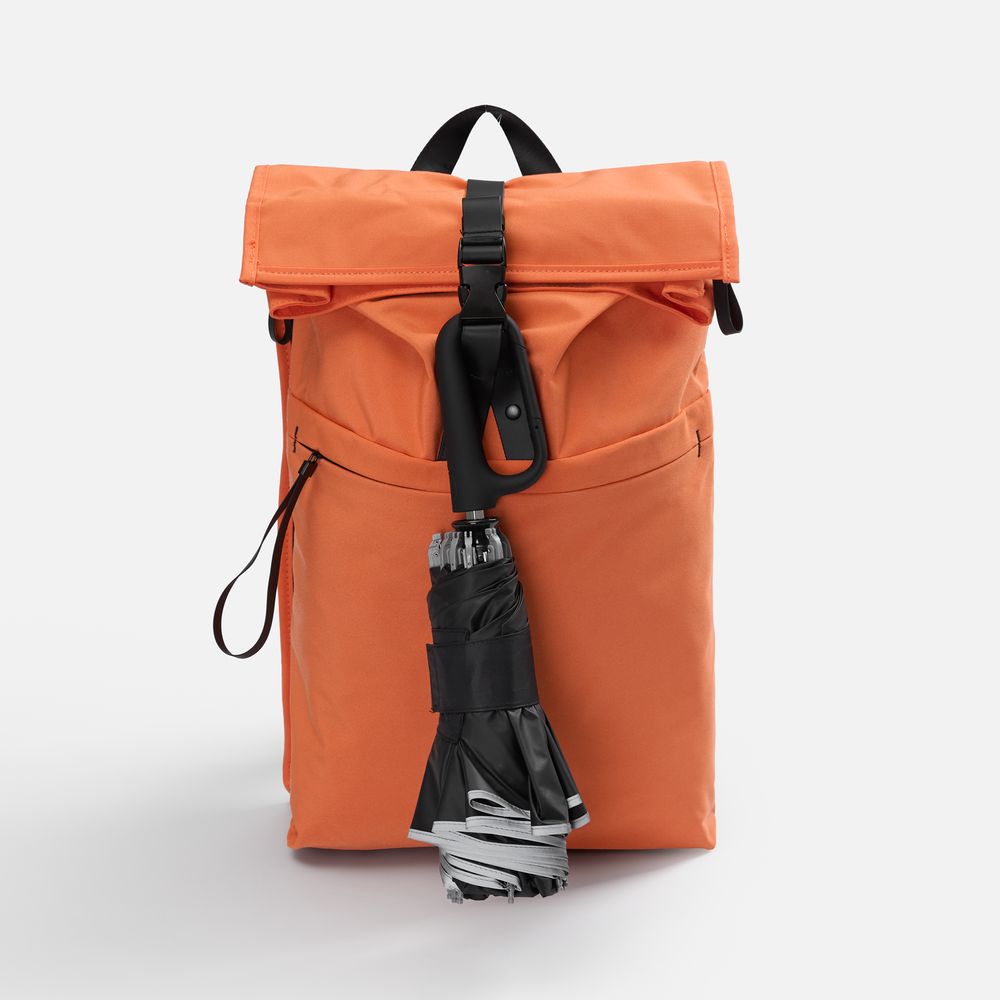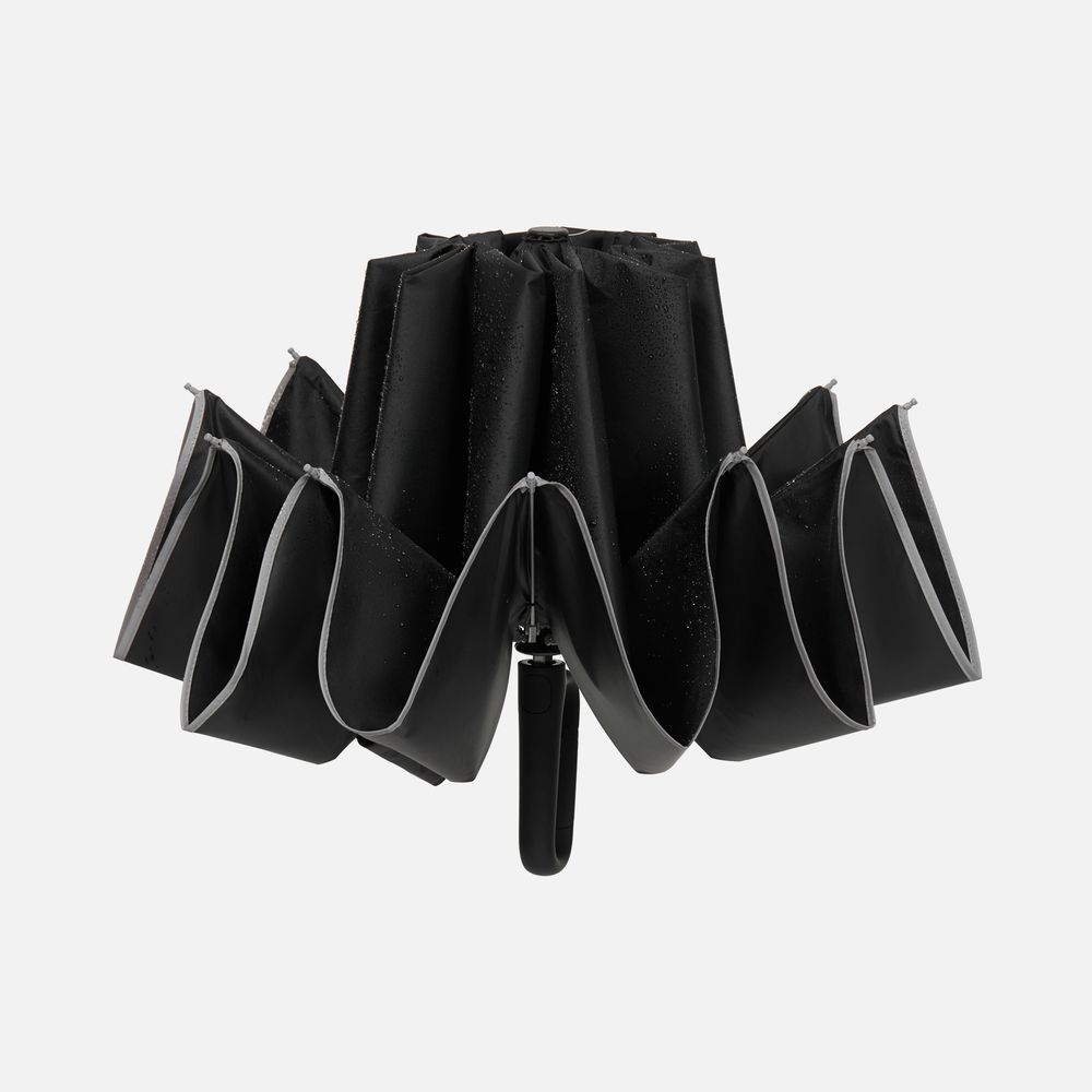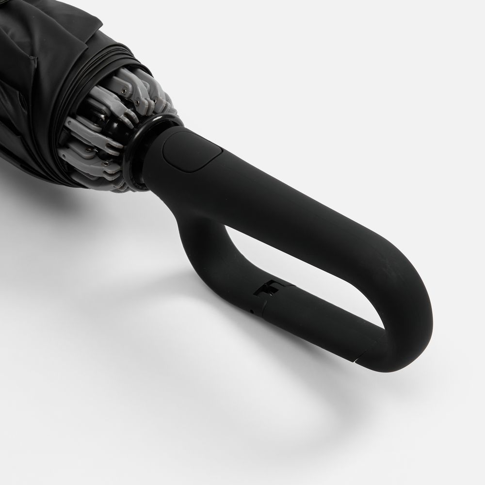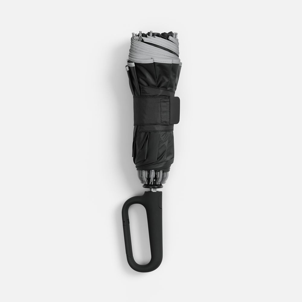 Складываясь после дождя, зонт прячет мокрую поверхность внутри, а сухая остается снаружи: так в закрытом положении он не побеспокоит окружающих и не намочит одежду. За ручку-карабин зонт удобно подвесить, например, на рюкзак.