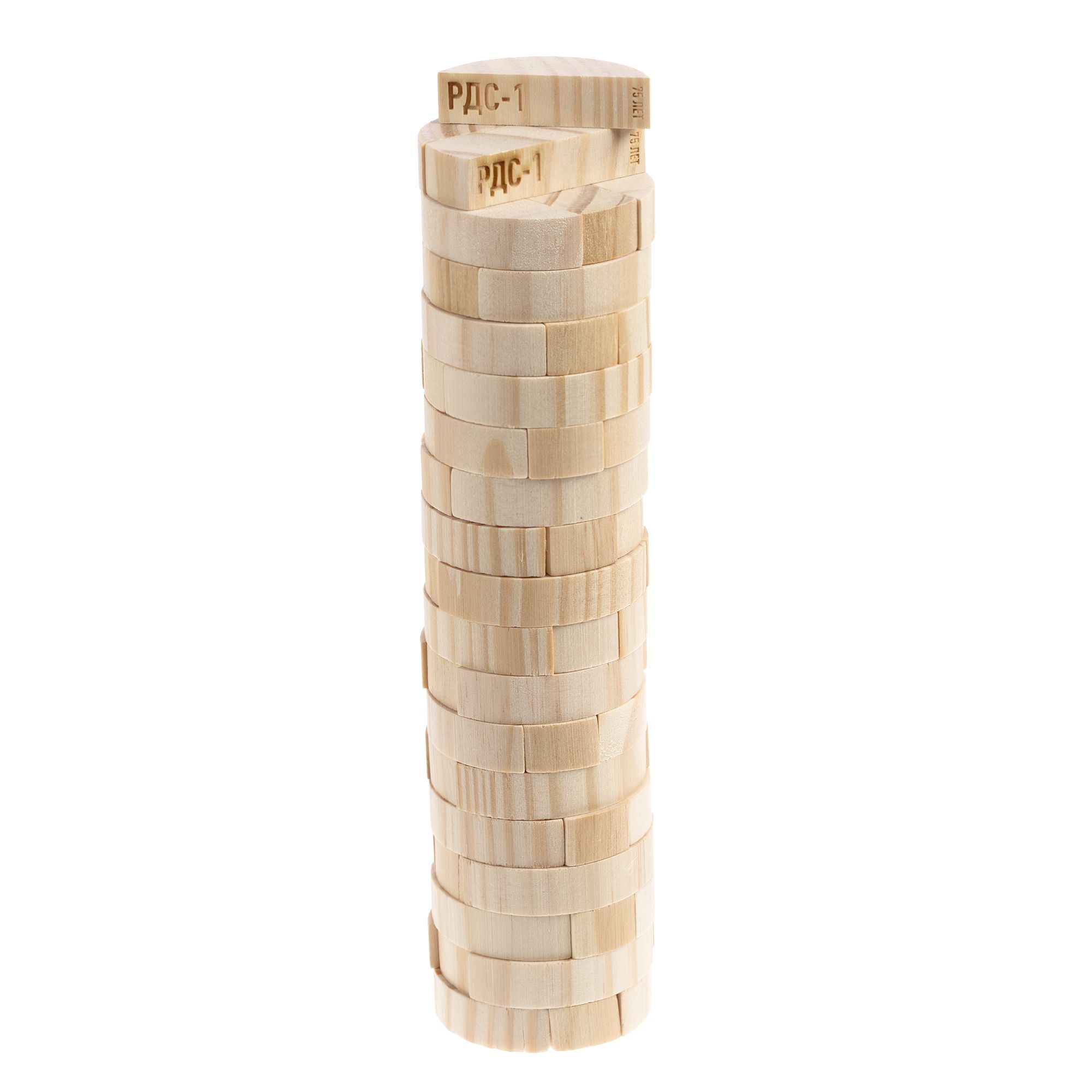 Игра состоит из 54 деревянных брусочков (18 этажей). Поставляется в черной картонной коробке с контурным изображением башни. Инструкция с правилами в комплекте.